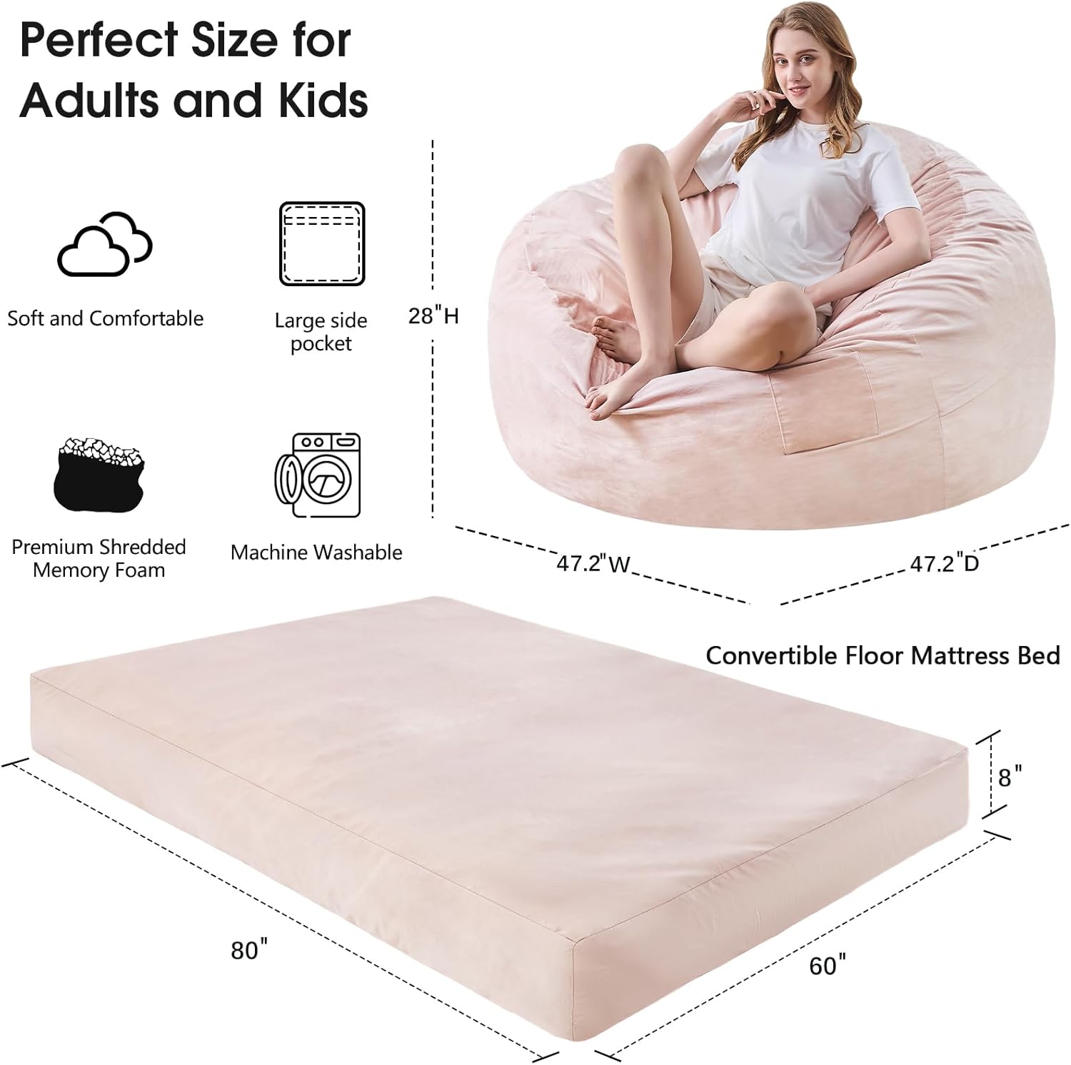 Bean Bag Chairs for Adults - Giant Bean Bag Chair Convertible Bean Bag Bed - Beanbag Chair with Micro Fiber Cover/Furniture Foam Filler - Floor Couch Sofa in Bedroom Dorm Room - Queen Pink