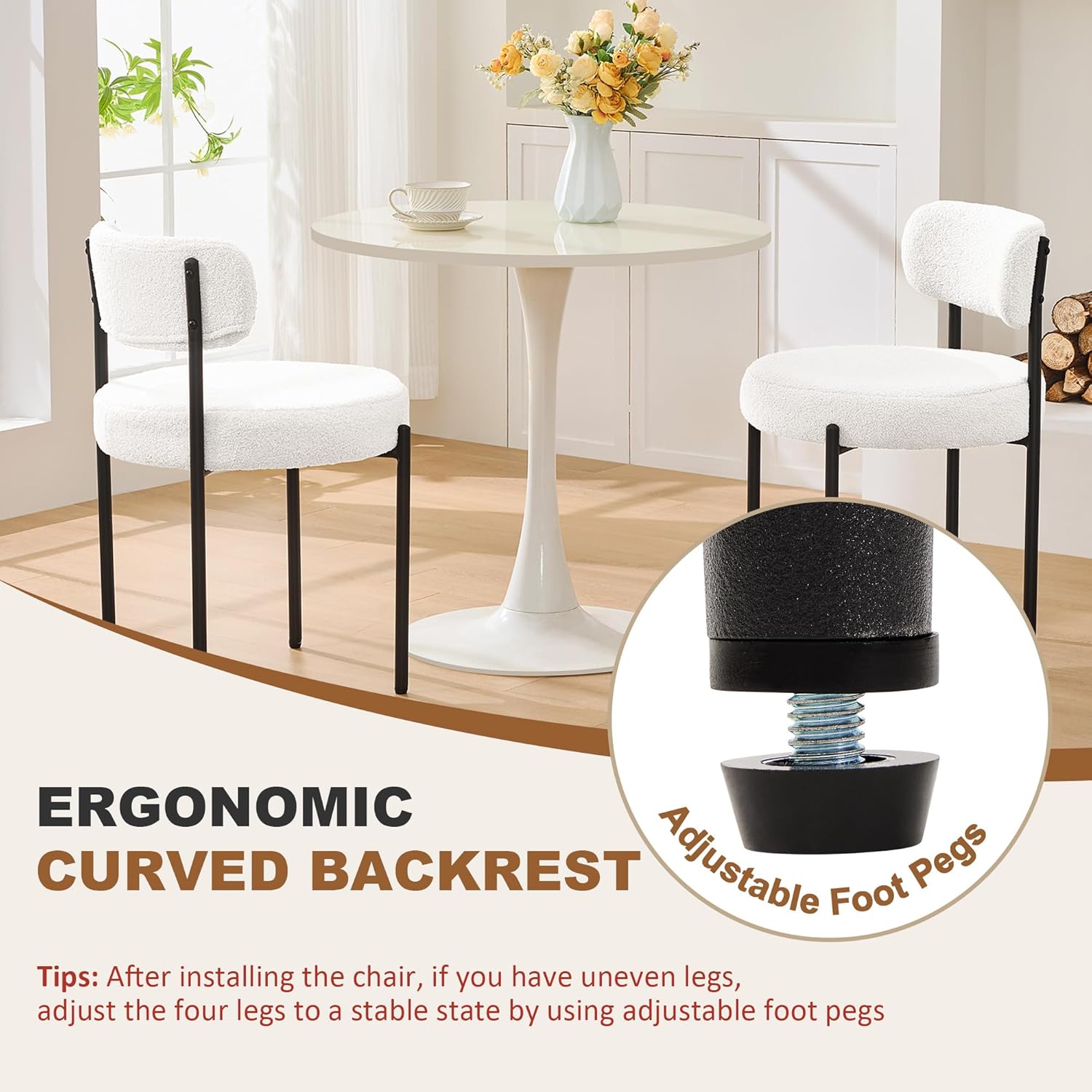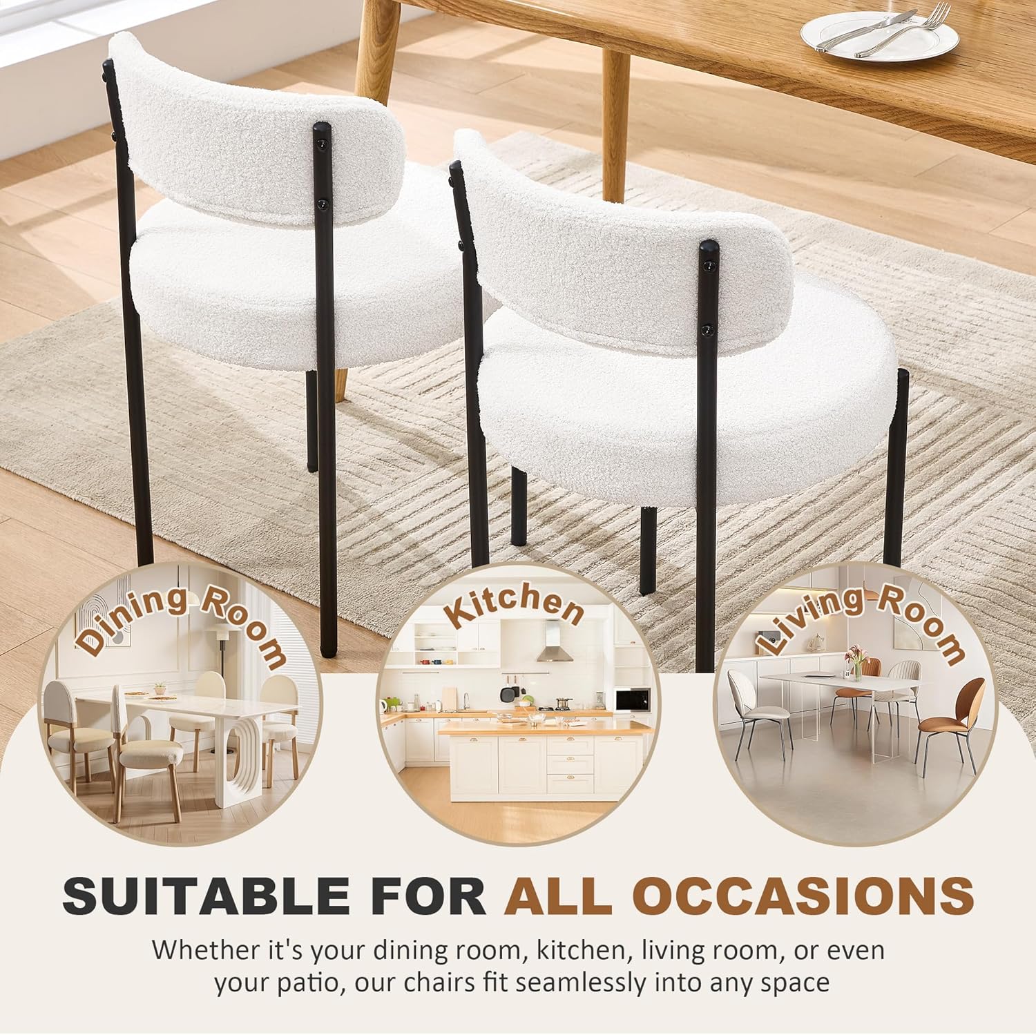 Dining Chairs Set of 2, White Boucle Dining Chair, Curved Backrest Upholstered Dining Room Chairs with Black Metal Legs, Mid Century Modern Dining Chairs for Kitchen, Living Room, White