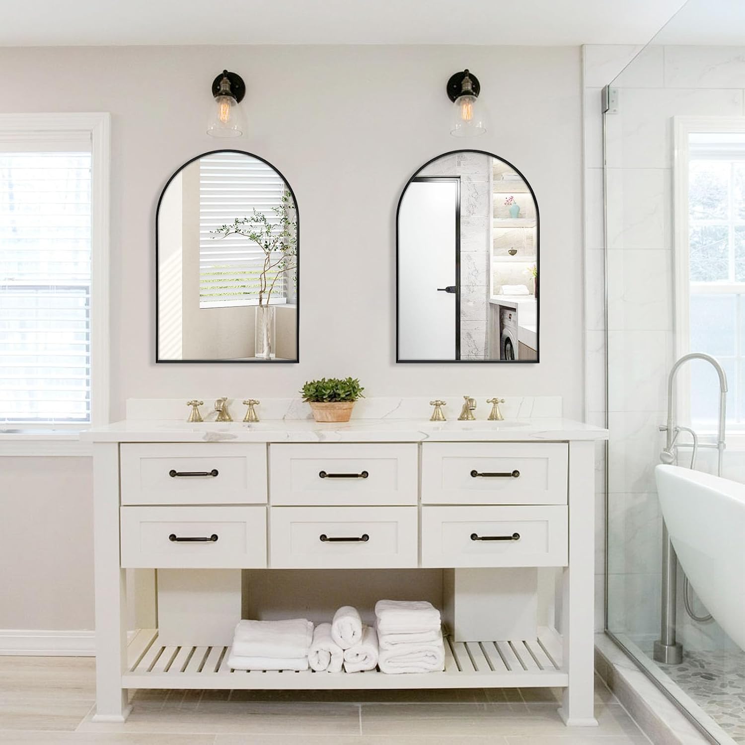 - Product Size: Our this black arched bathroom mirror size information is length: 24 inches/60.96 cm, width: 32 inches/81.28 cm. Thickness is 1 inch/2.54 cm. Please measure the required size before purchasing