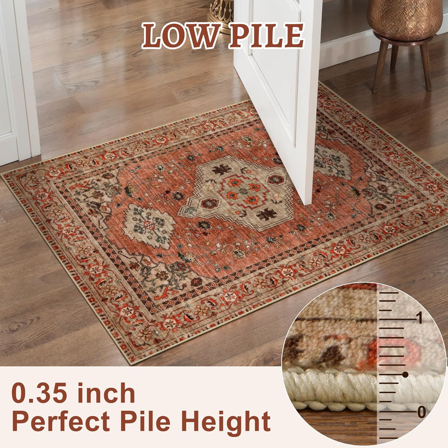 Boho Small Area Rug, 2x3 Washable Rug for Entryway, Vintage Throw Rug Oriental Non Slip Indoor Front Door, Distressed Terracotta Door Mat Carpet, Soft Low Pile Rugs for Entrance Kitchen Bedroom