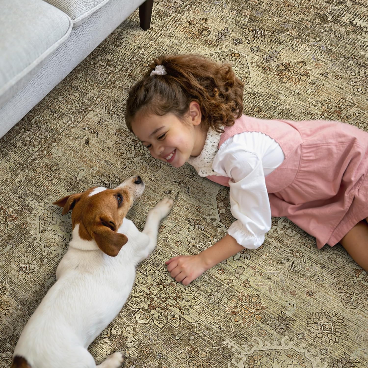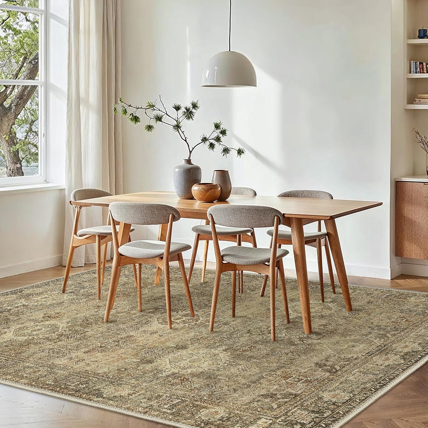 GENIMO 8X10 Area Rugs for Living Room, Machine Washable Non Slip Vintage Floral Patchwork Rug, Thin Low Pile Chenille Carpet Rugs for Bedroom, Dining Room, Straw