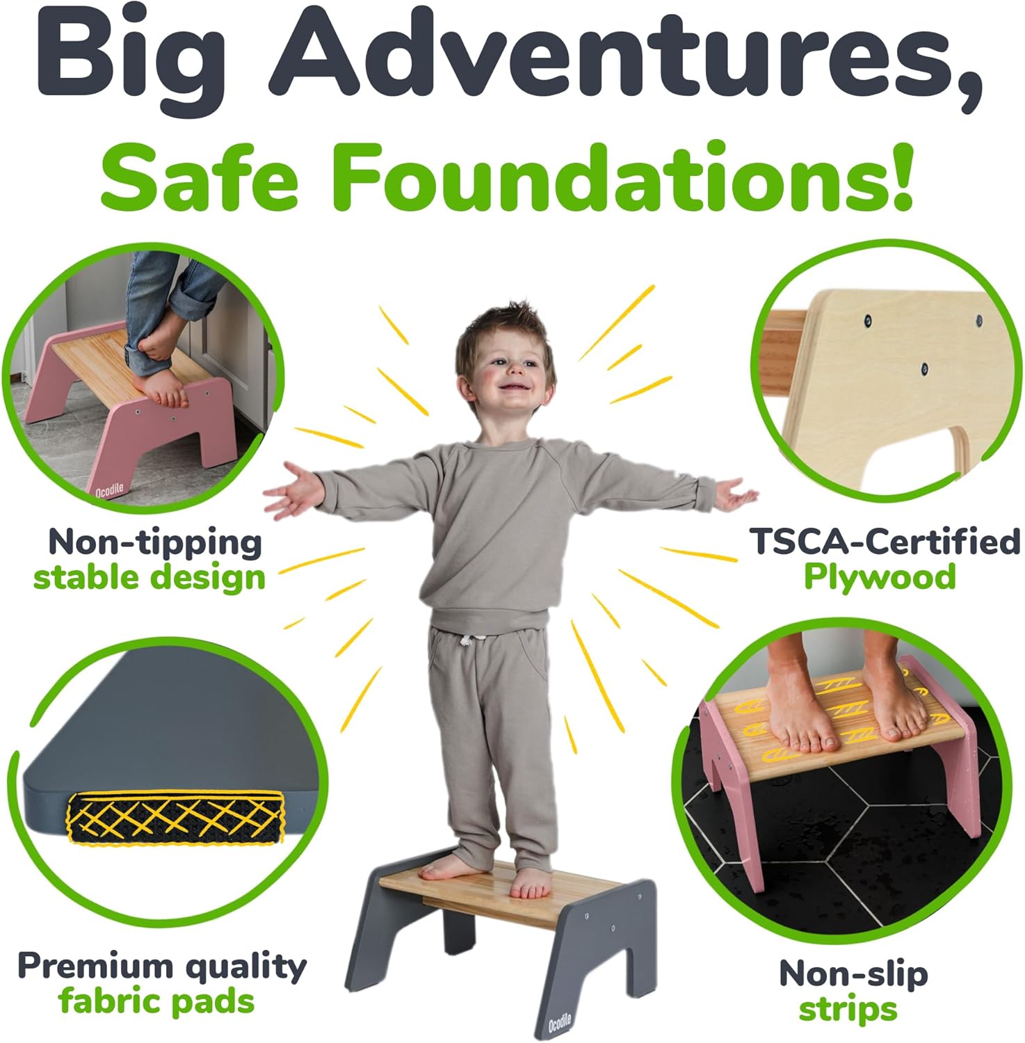 - Stable, Non-Slip, and Tip-Resistant - Designed for safety, this kids step stool features a wide base, solid frame, and black pads that work effectively on tile, wood, or laminate floors.