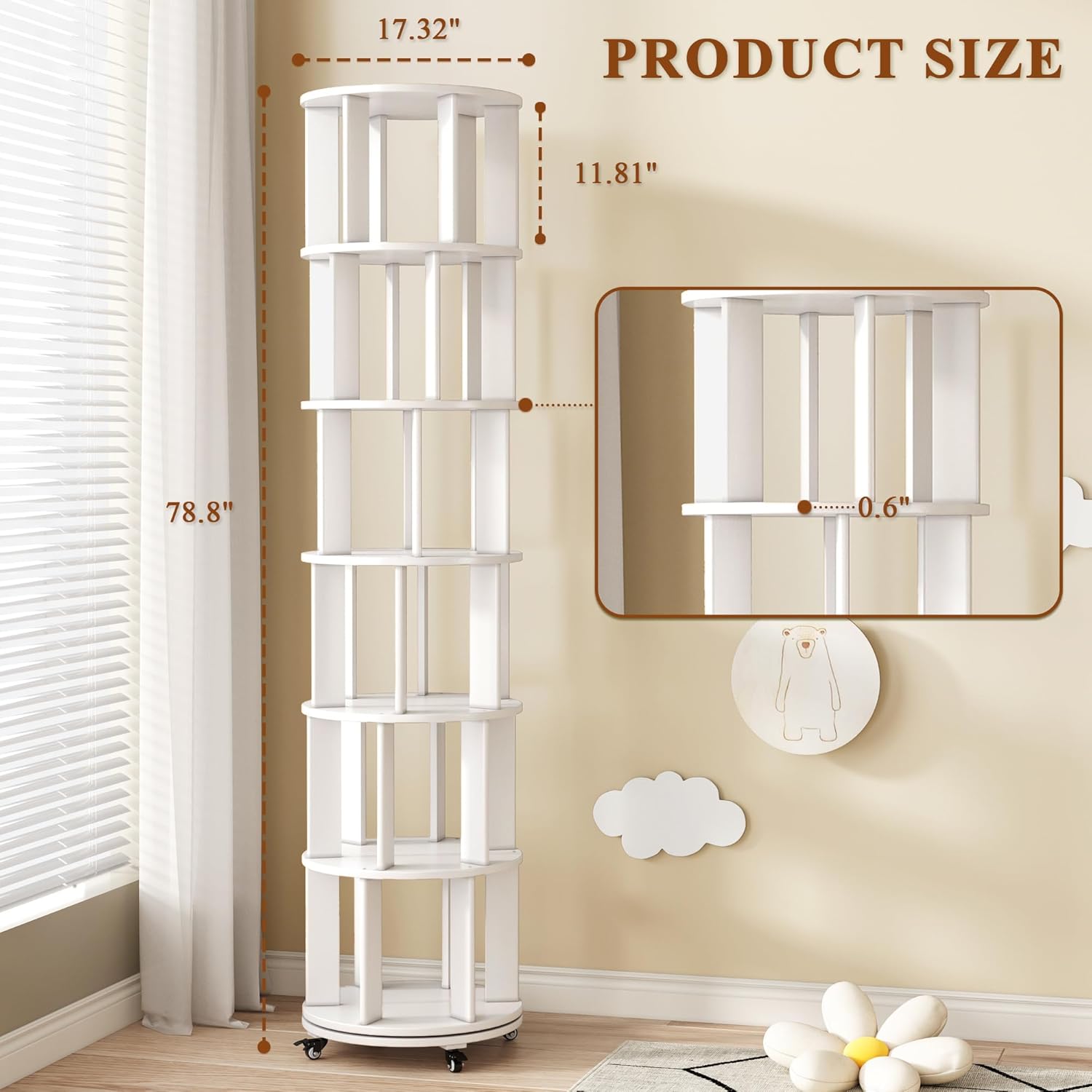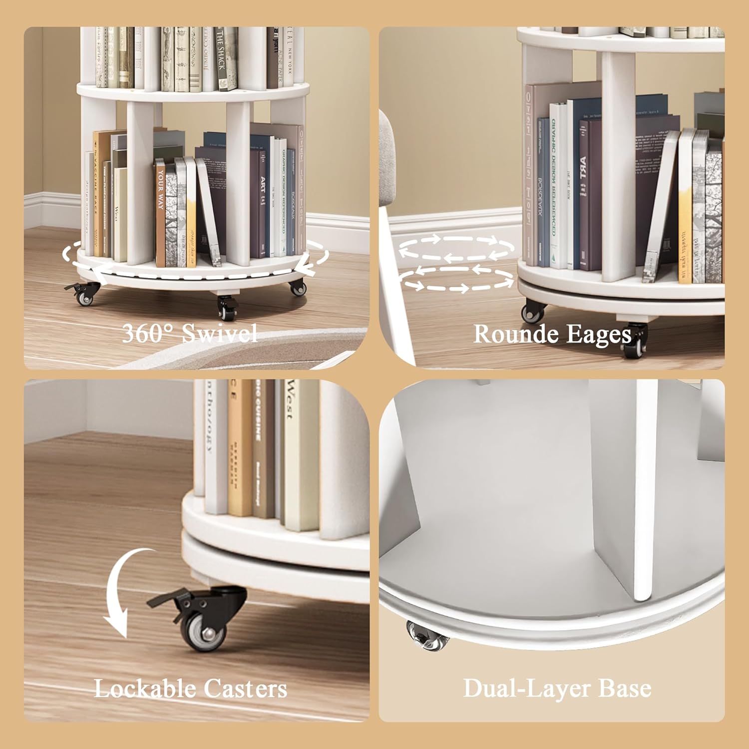- 360° Safe Rotating Bookshelf: Our swivel bookshelf makes grabbing your favorite reads a breeze. With a gentle spin, your beloved books are right at your fingertips. What's more, keeping your family safe,it comes with lockable caster wheels, ensuring it stands firm even if your playful kids or energetic pets bump into it. With no worries, the easy-roll wheels allow you to effortlessly move the bookshelf to any room, like the bedroom, living room, playroom, or study room
