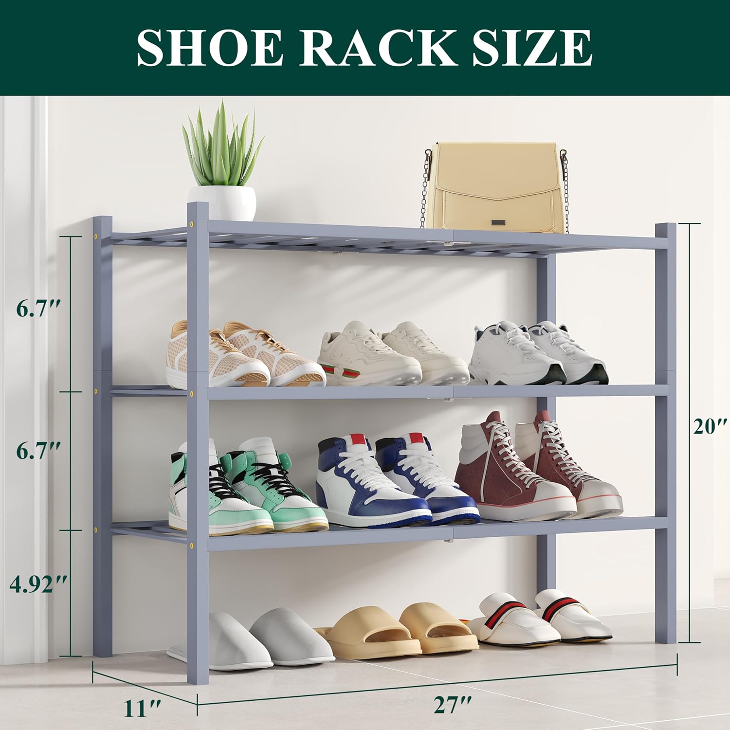 - [Large Capacity & Sturdy] 3 tiers measuring 26.77" W × 11.02" D × 19.49" H, each shelf holds up to 30 lbs, suitable for shoes, bags, baskets, plants, or other daily essentials