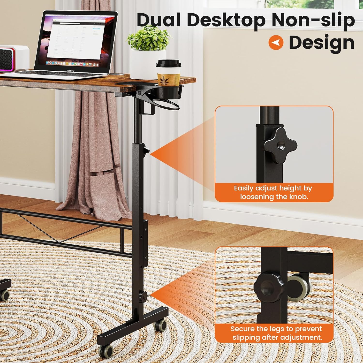 - Easy to Move, Stable to Work: Equipped with four 360° lockable caster wheels, this rolling laptop desk transitions smoothly between rooms. Lock the wheels in place when in use for a rock-solid setup, whether beside your sofa, next to your treadmill, or at your bedside
