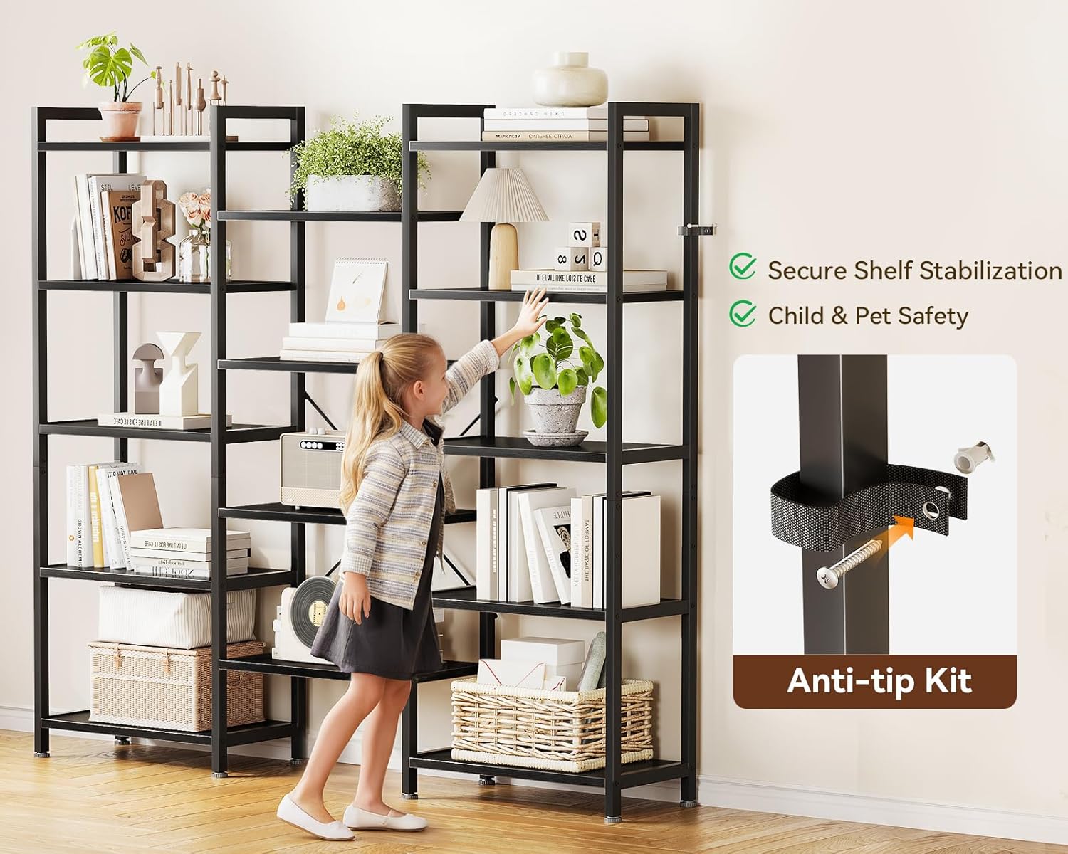Casaottima Triple 5 Tier Bookshelf, Large Bookcase with 14 Open Display Shelves, Modern Industrial Book Shelves Book Case for Bedroom, Wide Standing Shelving Unit for Living Room Home Office, Black