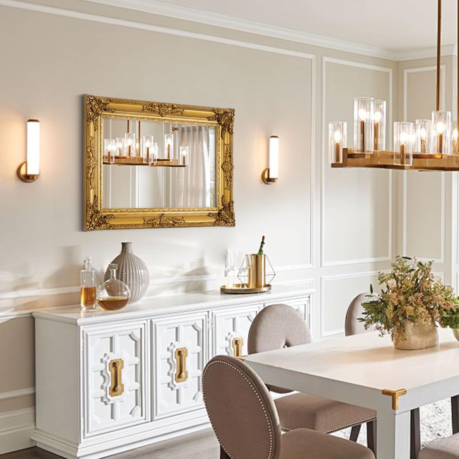 - Antique Gold Decorative Mirror: Ornate gold mirror with wooden frame adorns the traditional rectangle mirror, envelops the space in a luminous and enchanting nostalgia, exudes a charming and timeless appeal, creating a focal point that captures the essence of classic beauty