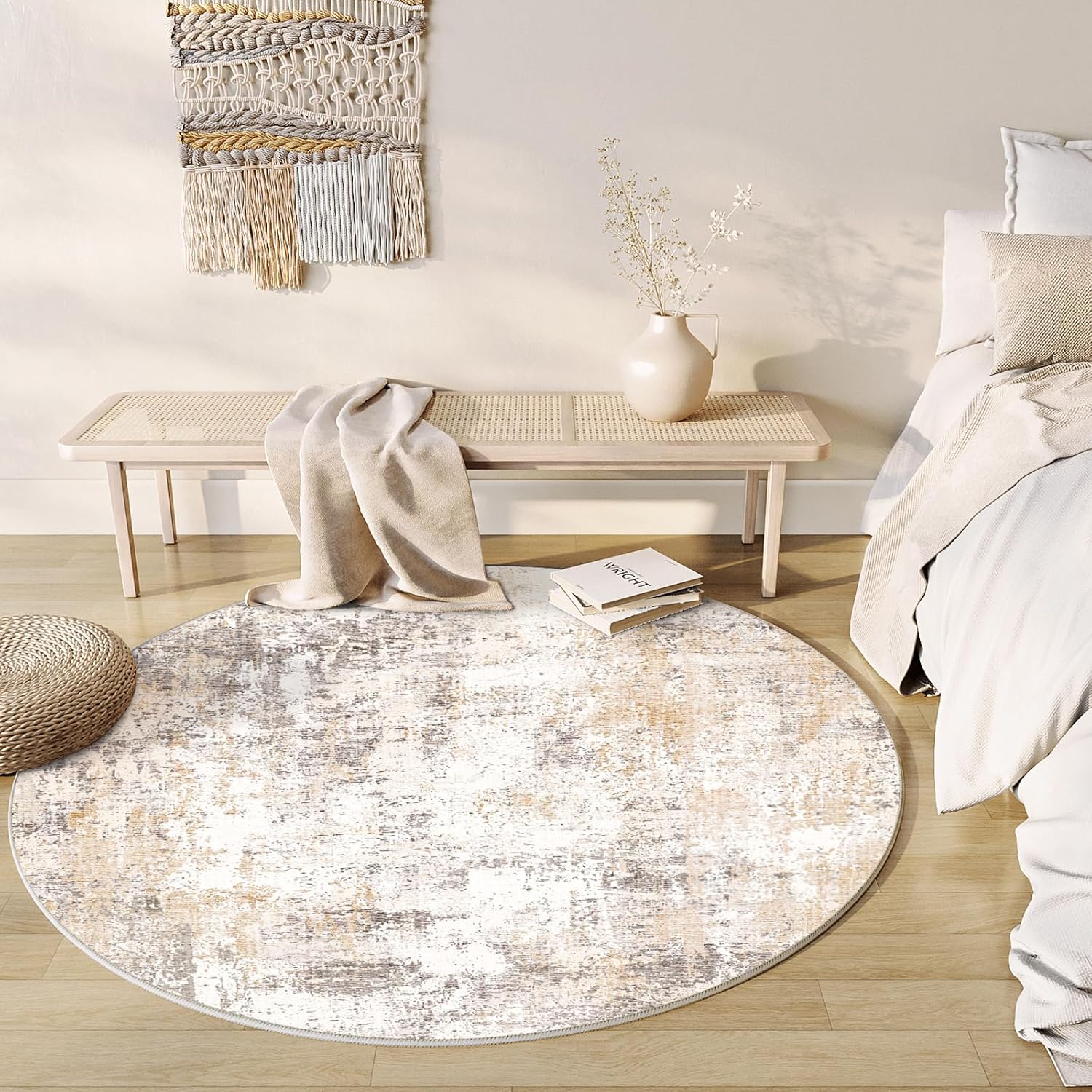 6x6 Washable Round Rug Beige Grey Neutral Abstract Living Room Bedroom Area Rug Non Slip Soft Low Pile Indoor Floor Carpet for Office Dining Room Kitchen Entryway