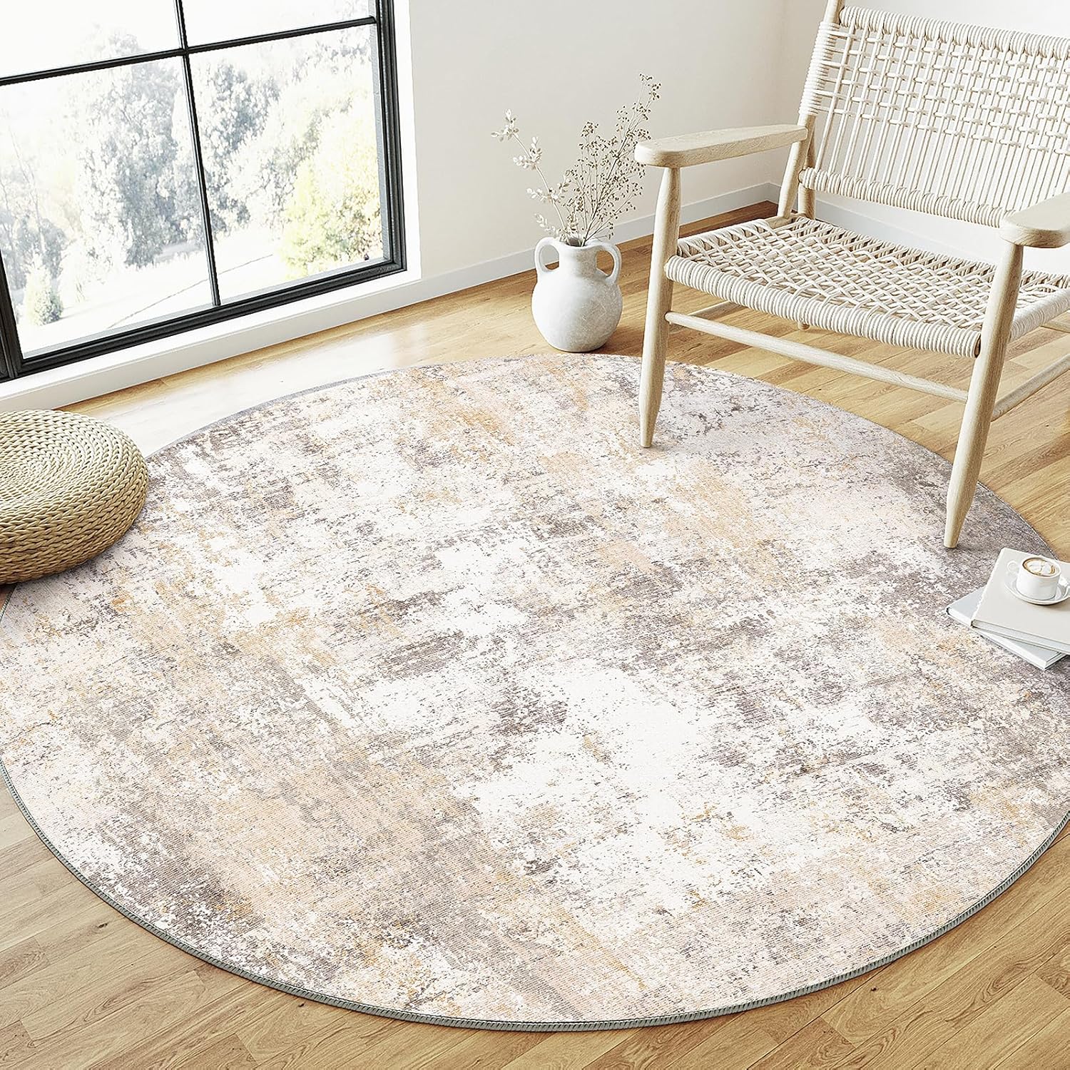 3x3 Washable Round Rug Beige Grey Neutral Abstract Entryway Non Slip Low Pile Area Rug Living Room Bedroom Indoor Doormat Small Soft Carpet for Entrance Bathroom Kitchen