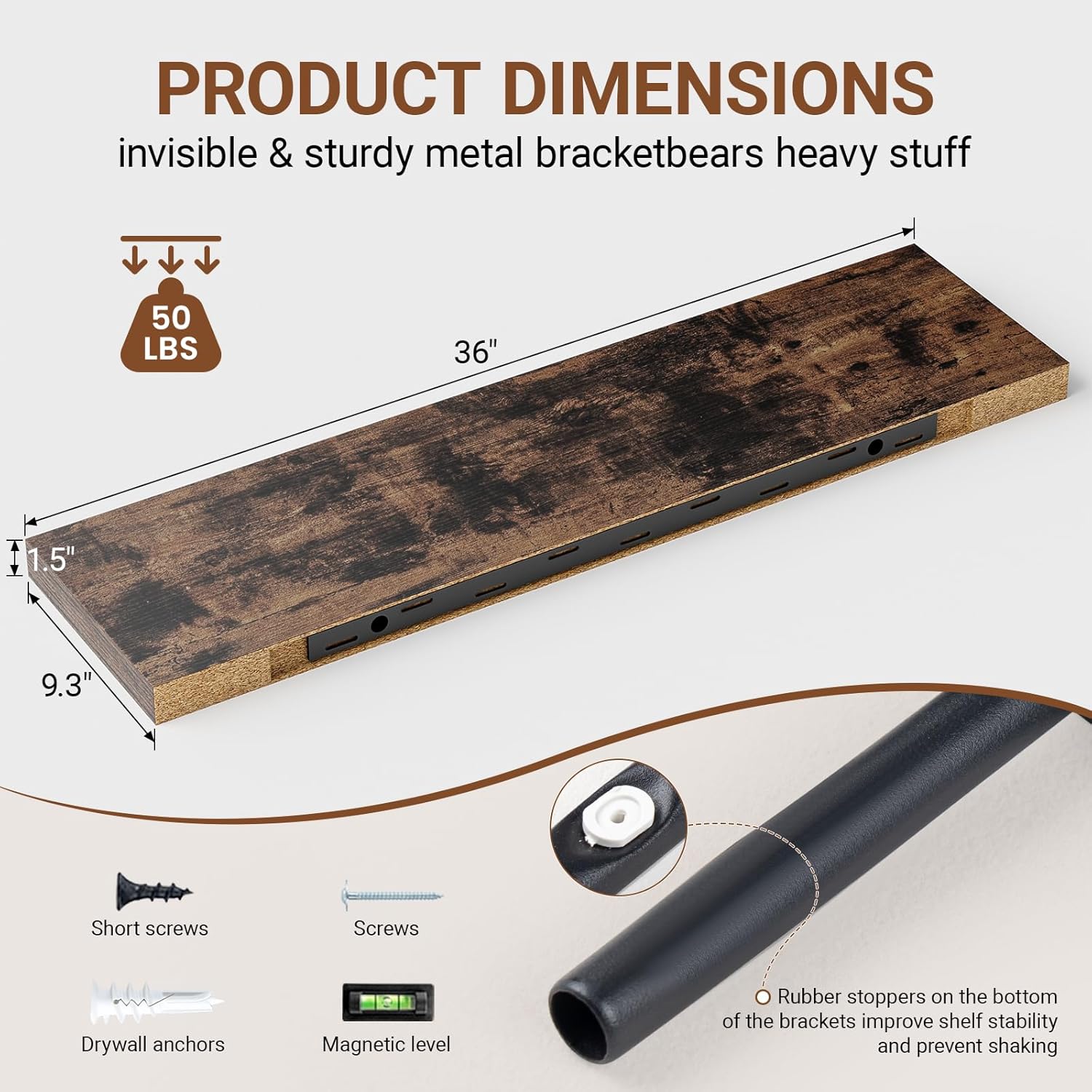 - 【Longer Design】Our pretty 36 inch wall shelves are 36"W x 9.3"D x 1.5"H.Our dark brown floating shelves is longer than traditional designs and can hold more items.The 36 inch floating shelf optimize wall space,helping organize essentials without taking up floor space in your home.