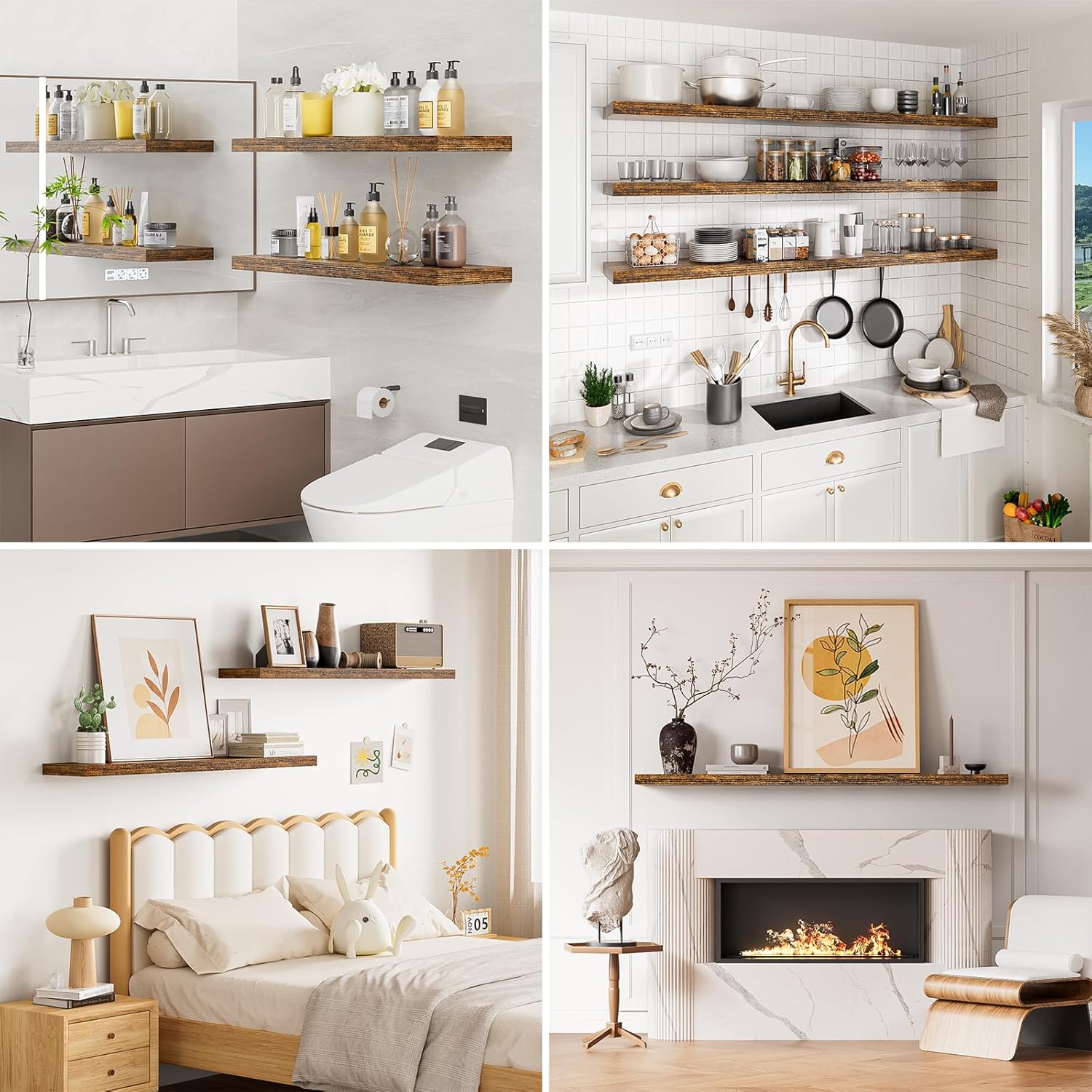 - 【Longer Design】Our pretty rustic brown floating shelves are 32"W x 9.3"D x 1.5"H.Our 32 floating shelves is longer than traditional designs and can hold more items.The brown floating shelves optimize wall space,helping organize essentials without taking up floor space in your home.