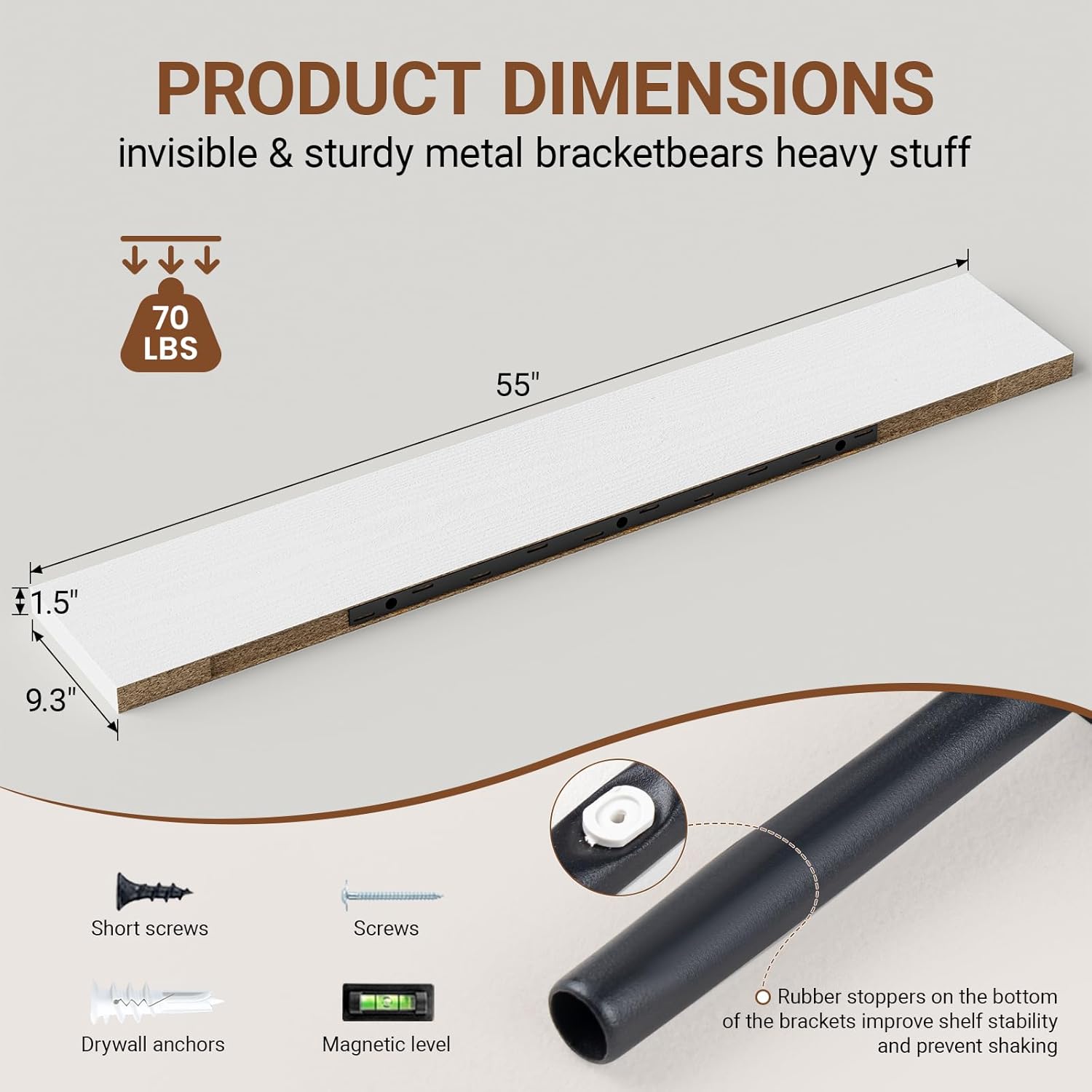 - 【Longer Design】Our pretty white floating shelves are 55"W x 9.3"D x 1.5"H.Our white floating shelf is longer than traditional designs and can hold more items.The floating shelf optimize wall space,helping organize essentials without taking up floor space in your home.