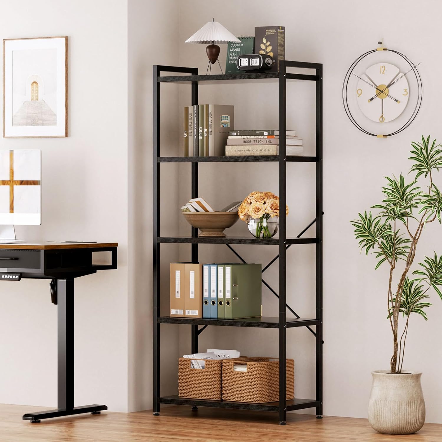 Casaottima Book Shelf, 5 Tier Bookshelf, Modern Wood Bookcase Shelves for Bedroom, Industrial Display Shelf for Living Room Home Office Kitchen, Standing Shelving Unit Storage Organizer, Black