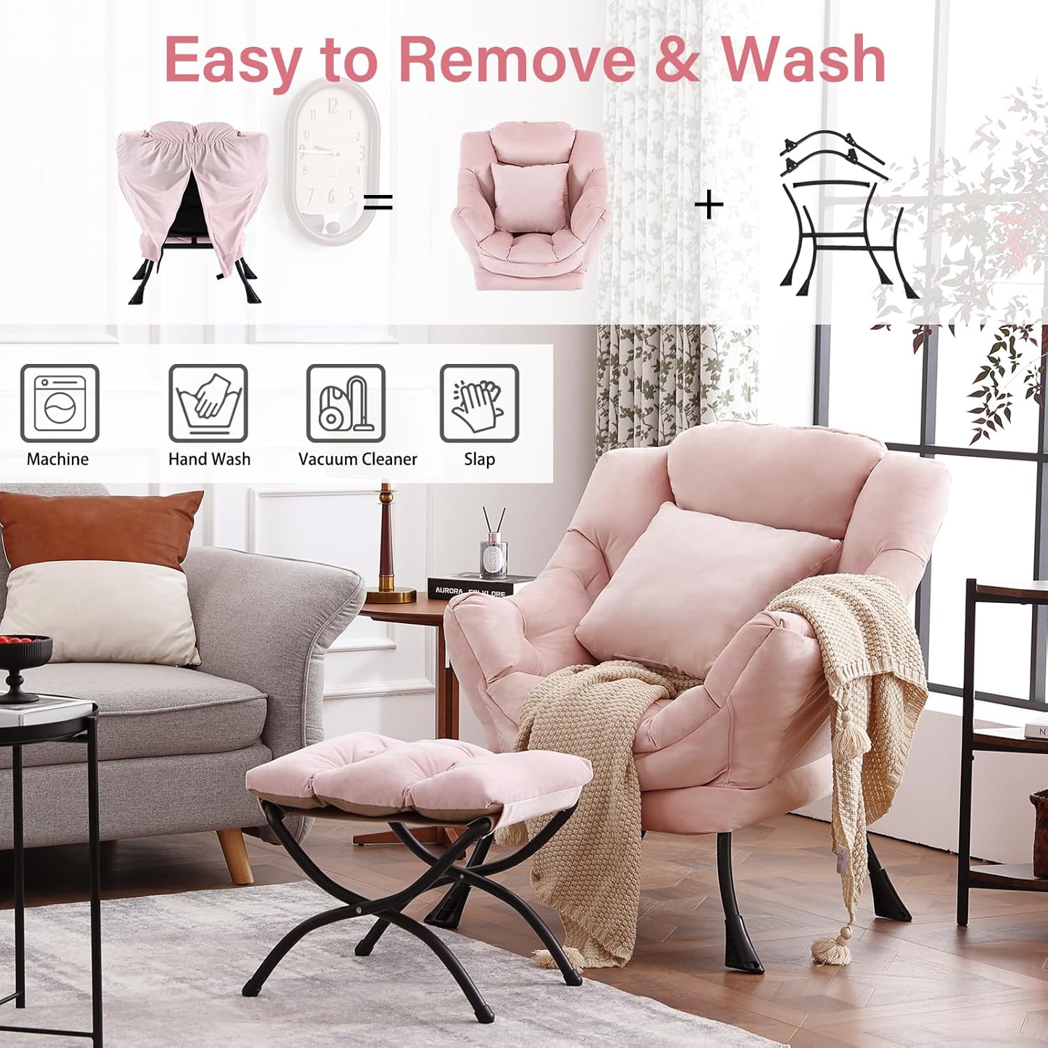 Large Lazy Chair with Ottoman, Accent Reading Chair with a Throw Pillow, Cozy Lounge Armchair, Leisure Sofa Chair for Living Room, Bedroom, Dorm, Velvet Pink