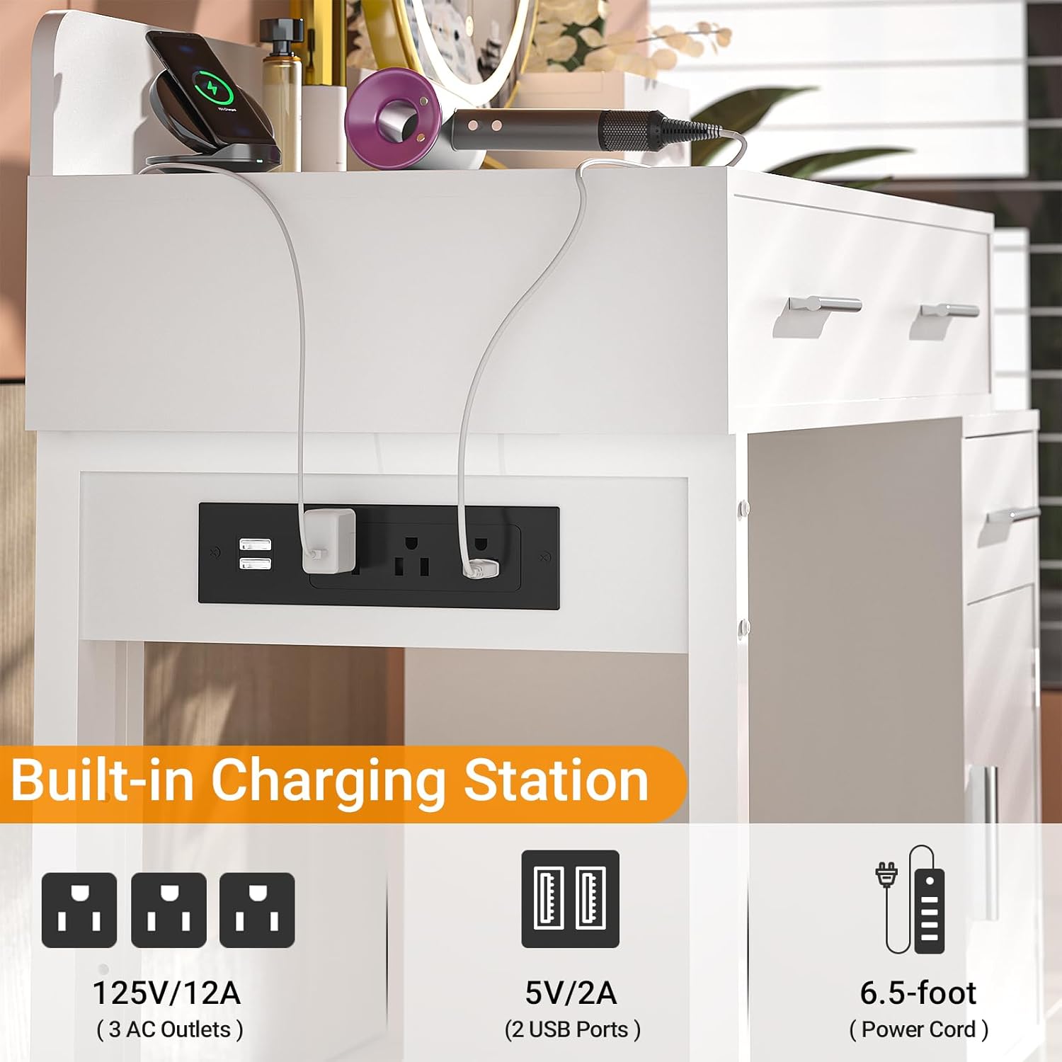 - Vanity Desk with Charging Station: Come with updated design charging station with 3 AC outlets and 2 USB ports, you can easily use curling iron or hair dryer in front of the mirror, and charge your phone or other mobile devices during makeup.