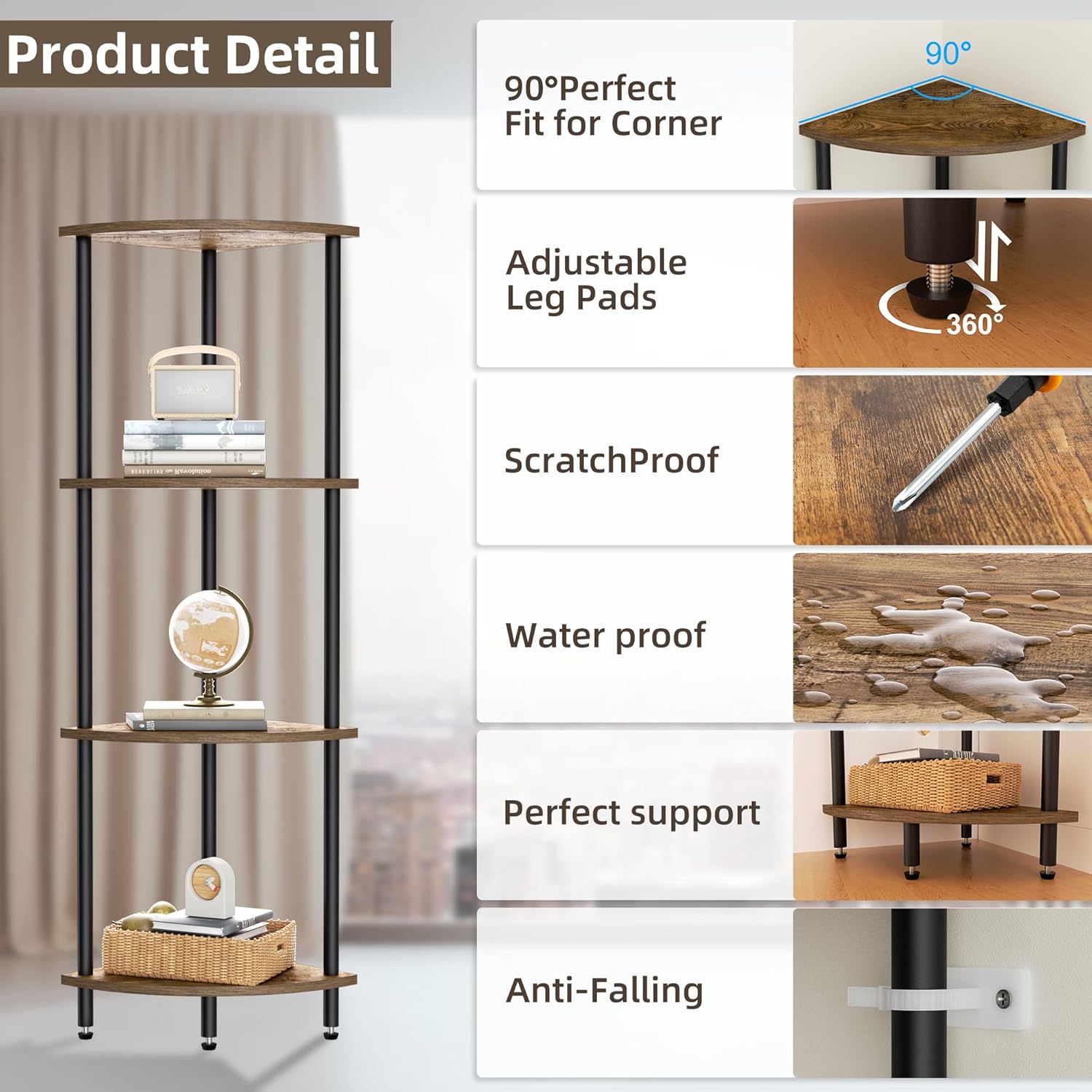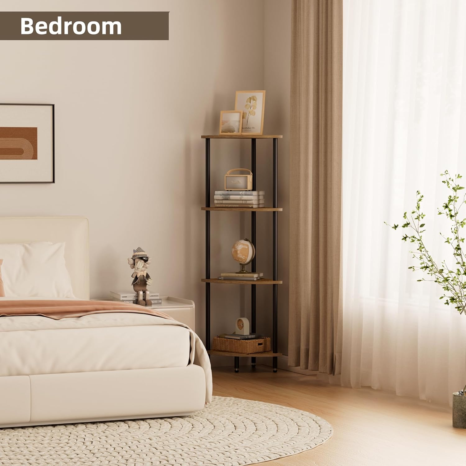 4 Tier Corner Shelf, Bookcase for Small Spaces, Corner Display Shelf, Plant Stand, Rustic Brown and Black,Suitable for Bedroom,Living Room,Kitchen