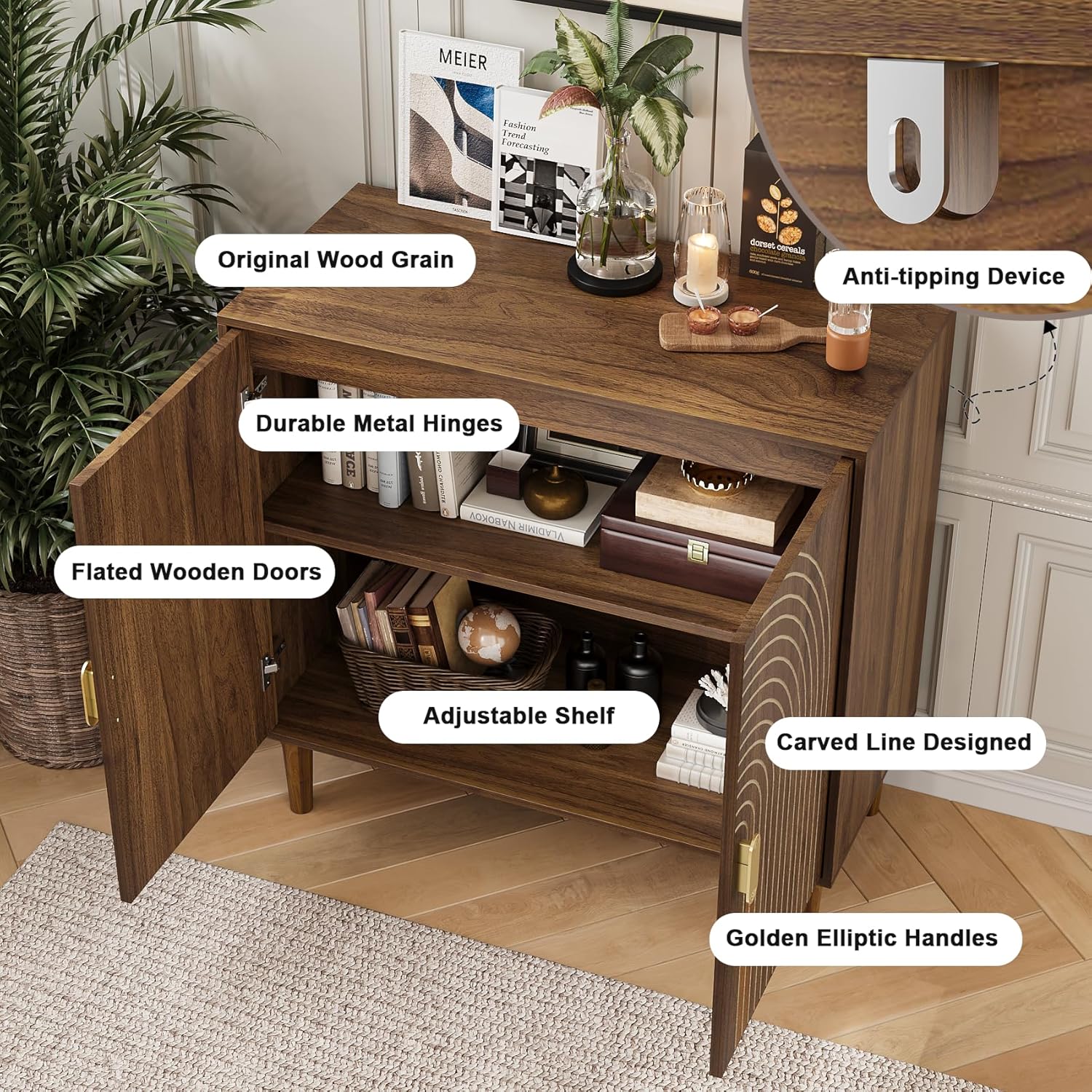 - The walnut sideboard buffet cabinet with storage,featuring lines decorated doors and golden handle, delivering perfect visual effect, add charming to your home, it can be suitable for various styles of home decoration, add charming to your home