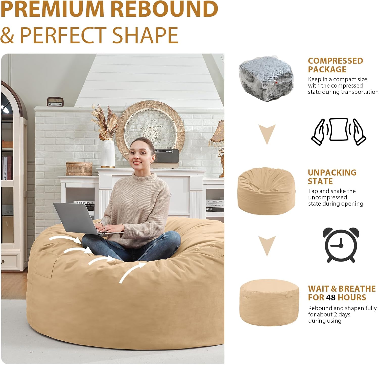 - MEMORY FOAM FILLING: Giant bean bag chair is filled with high rebound memory foam to provide you with comfort and fluffy support. Unlike other crushing foams, our memory foam bean bag chair can bounce back perfectly after use. Note: The bean bag chair is a compression package and need 2-3 hours to fluff it up for maximum comfort.