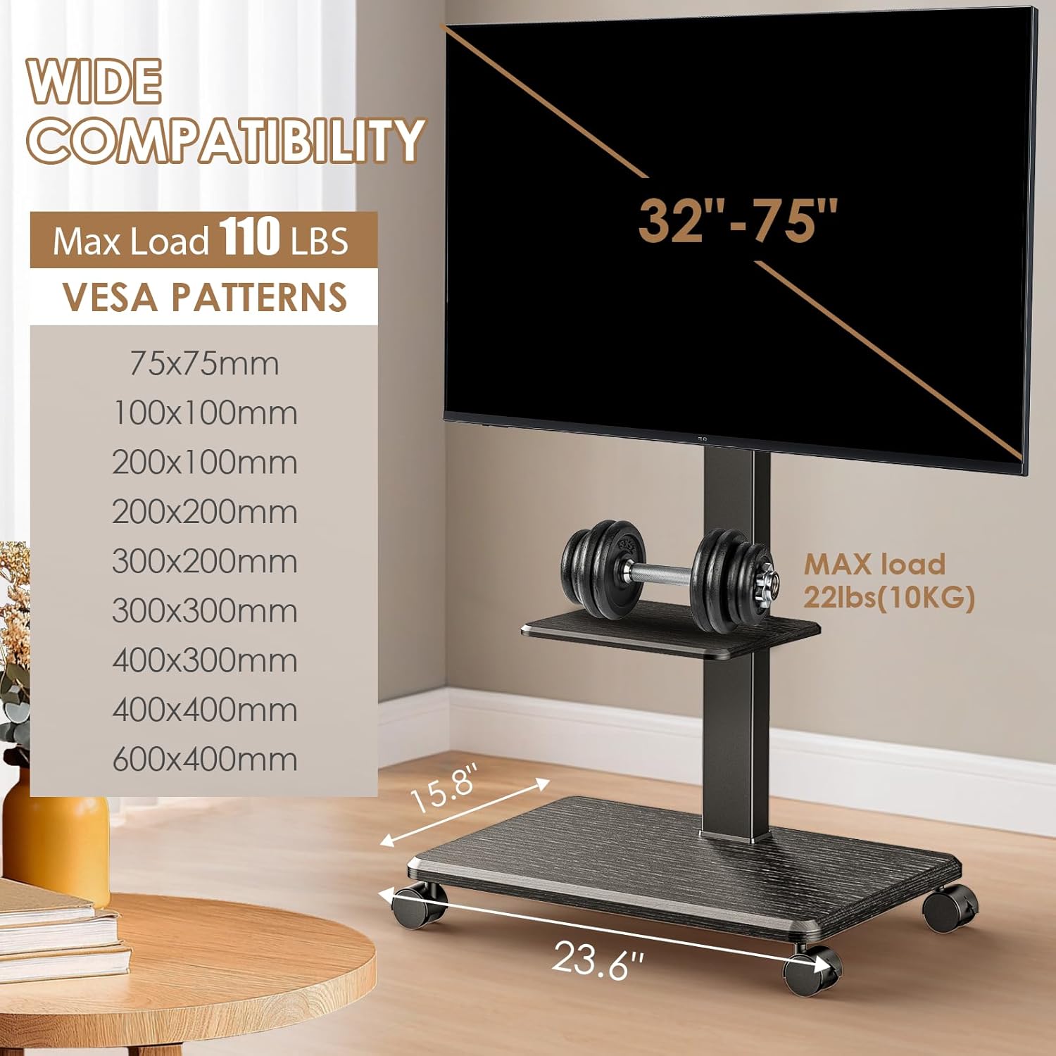 - Ultimate TV Mobility & Versatility: Designed as a portable TV stand on wheels, this mobile tv cart fits 32-75” TVs (VESA 200x200-600x400). Switch between landscape/portrait modes and enjoy 30° swivel rotation with ±5° tilt adjustment for glare-free viewing from any angle