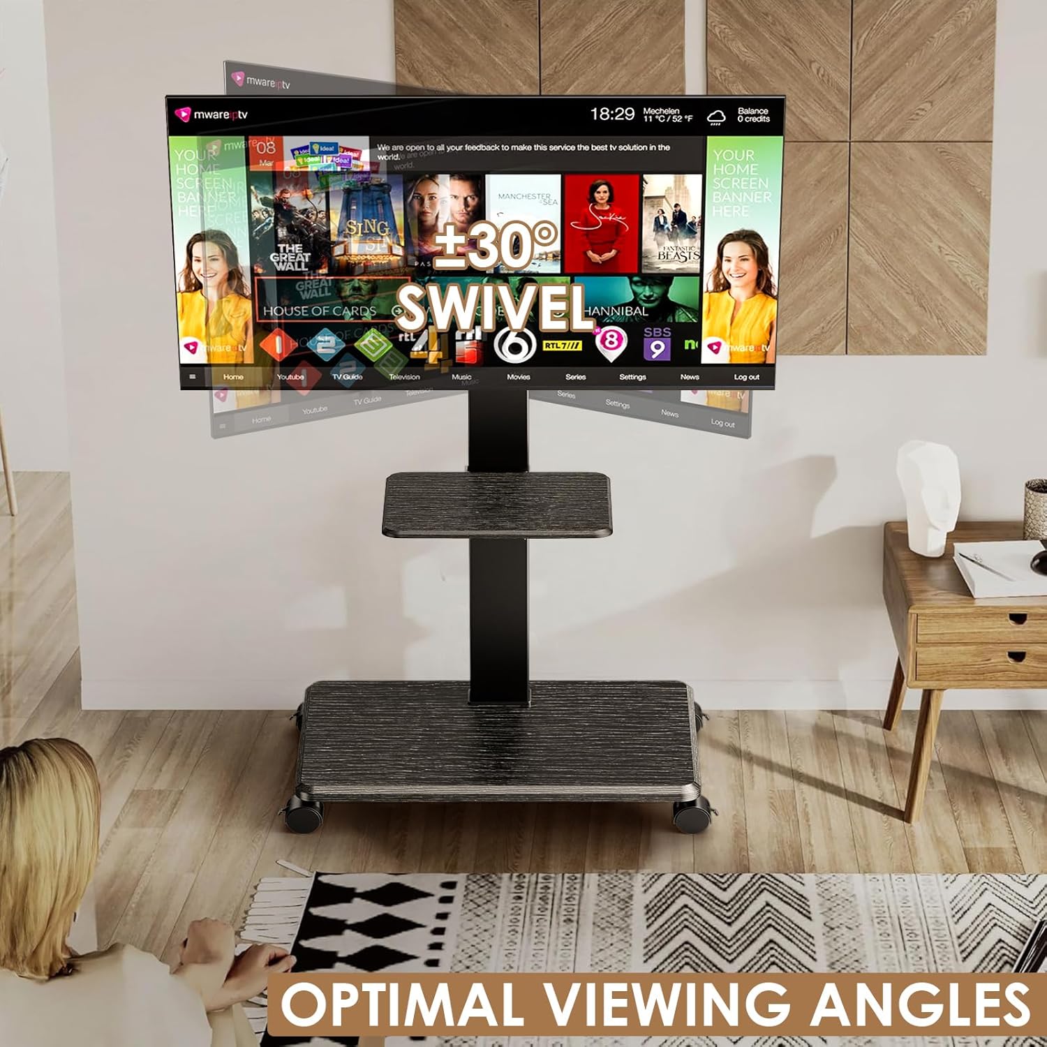 Mobile TV Stand with Wheels, Swivel Rolling TV Stand for 32-75 Inch TVs with Shelf, Landscape to Portrait, Height Adjustable Portable TV Cart with Tilt, VESA 600x400mm, 110lbs Capacity
