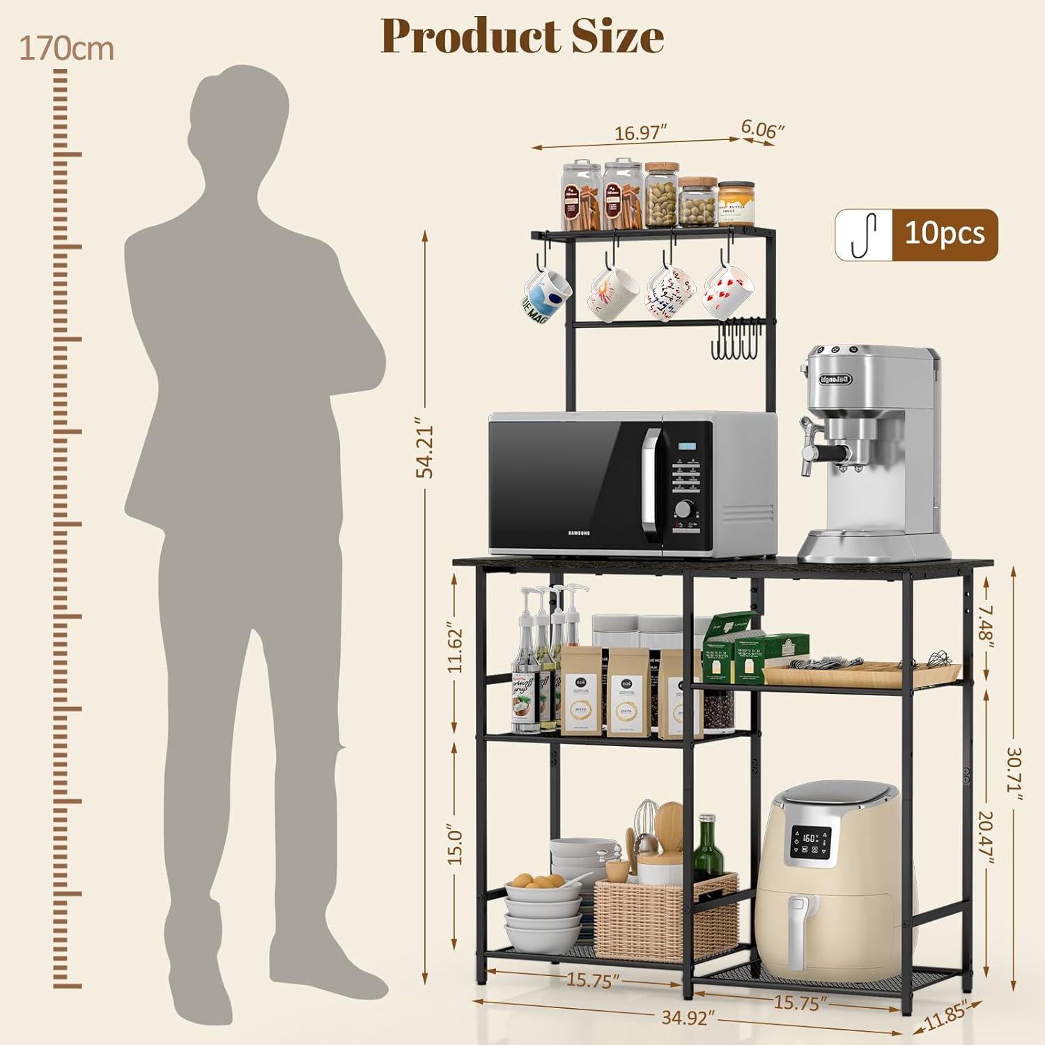 - [Multifunctional Kitchen Storage Rack]: The 6-layer baker's rack has 1 large countertop, 4 bottom partitions, 10 s-shaped hooks, and 1 top shelf, providing you with plenty of space to place the coffee maker, microwave oven, bread machine, pots and pans, spices and other supplies. It meets the diversified needs of kitchen shelves.