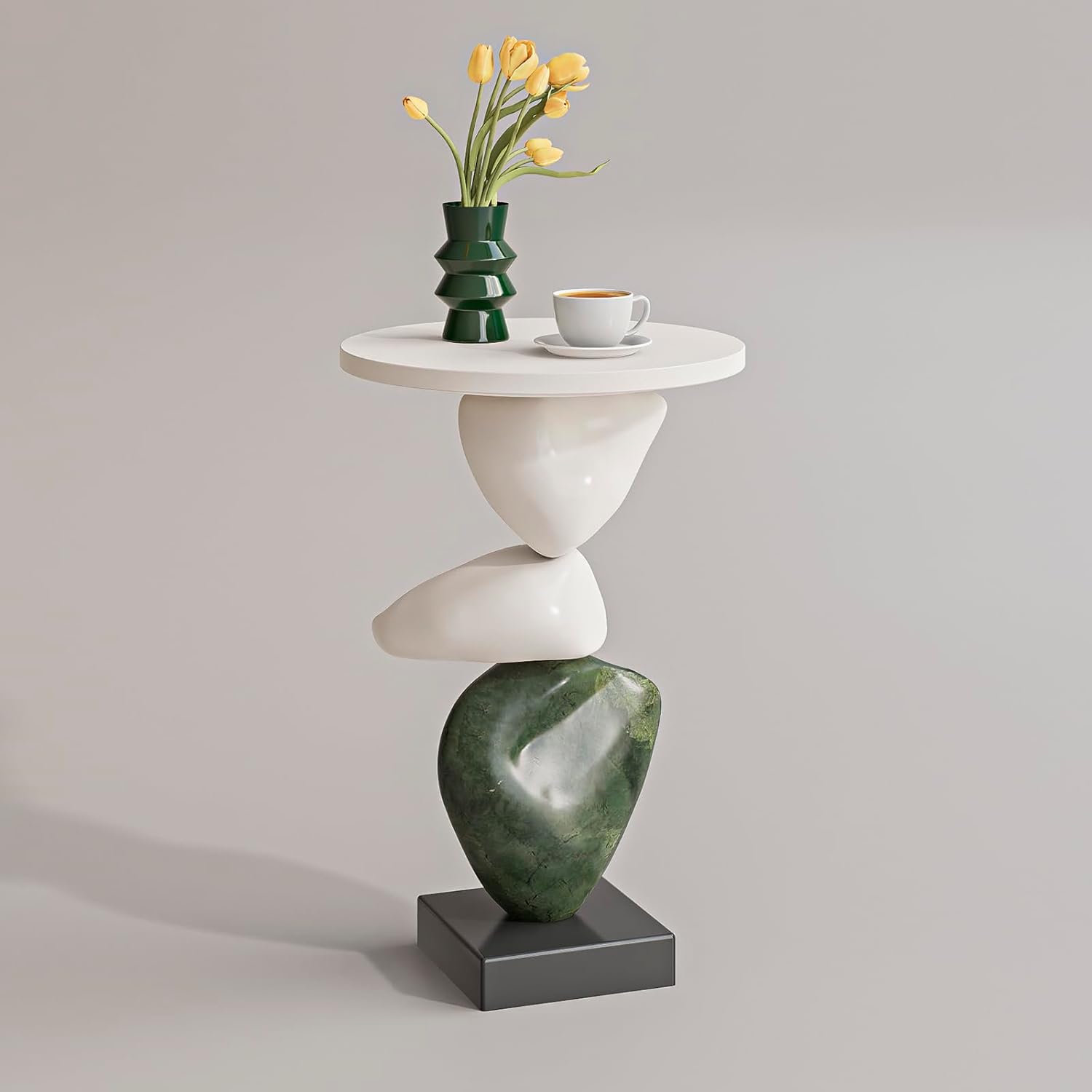 - Unique Artistic Design: Inspired by the art of stacked stones, this coffee table blends nature’s beauty with modern aesthetics. Its elegant FRP construction features a layered stone effect with a deep green base, and creamy white top for a sophisticated, balanced look.