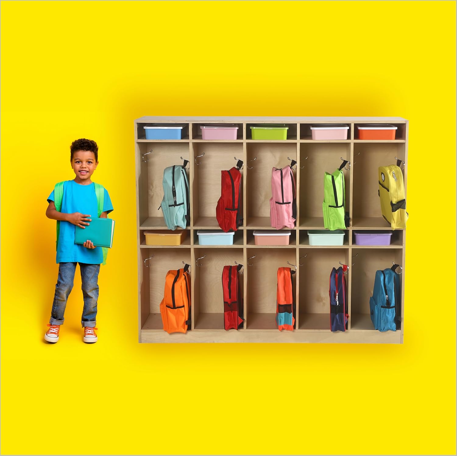 - Wooden Storage Unit has 10 open storage compartments, 20 double coat hooks, and 10 cubbies for storing jackets, lunchboxes, and supplies in a daycare, nursery, or preschoool