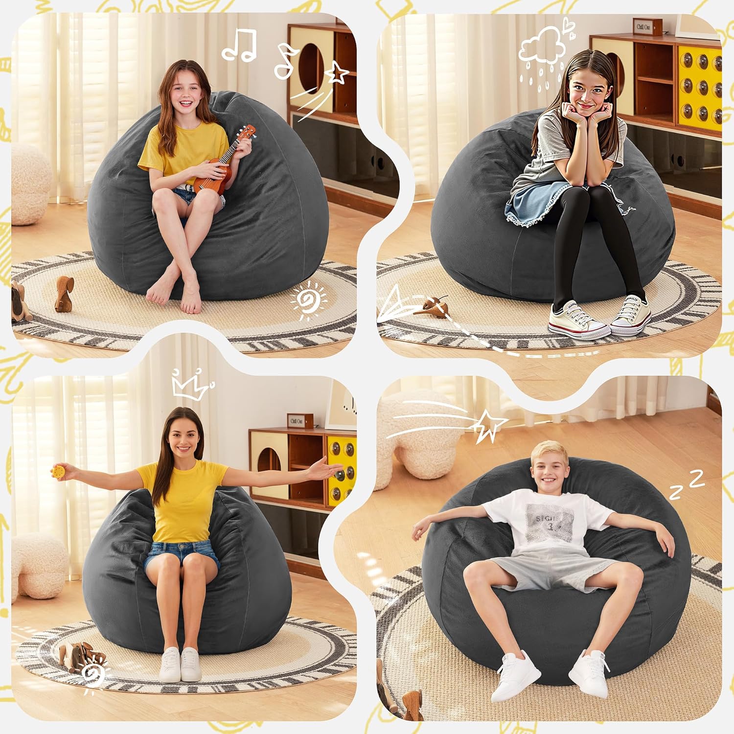 - Good Family Helper: If the use of bean bag chairs for a long time the sponge is no longer available, you can collect old stuffed animals, old pillows, old T-shirts and other stuffed inside, both environmental protection and reduce the amount of garbage disposal, to achieve the purpose of turning into an environmentalist.