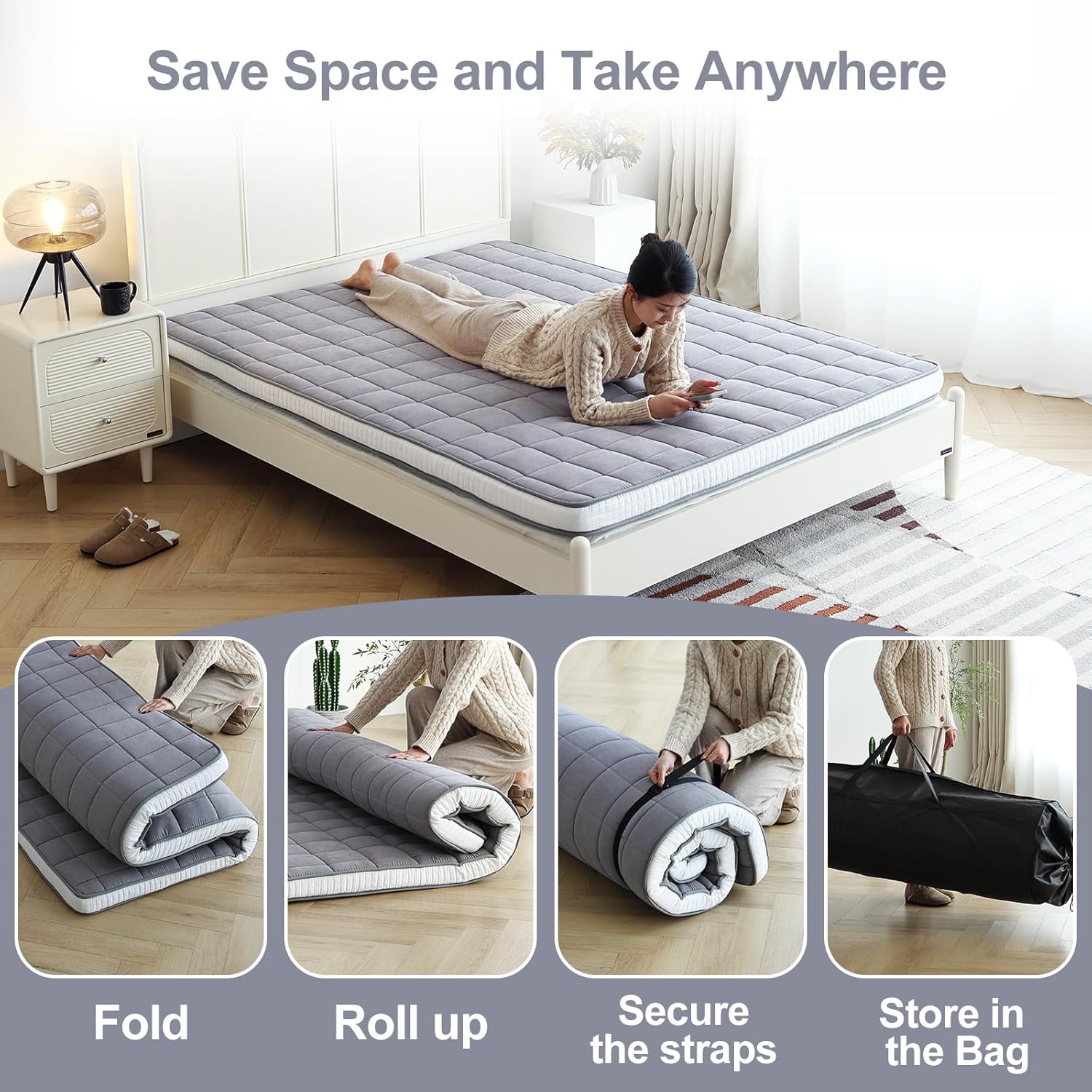 - 【Convenient Mattress Cover】: This futon mattress comes with a storage bag and two straps for easy transportation and storage. Whether you're going camping as a camping mat, as a mattress topper for tours, or as a relaxing rest mat for hosting guests, this foam sleeping mat is designed for convenience, ensuring you can enjoy comfort wherever you go