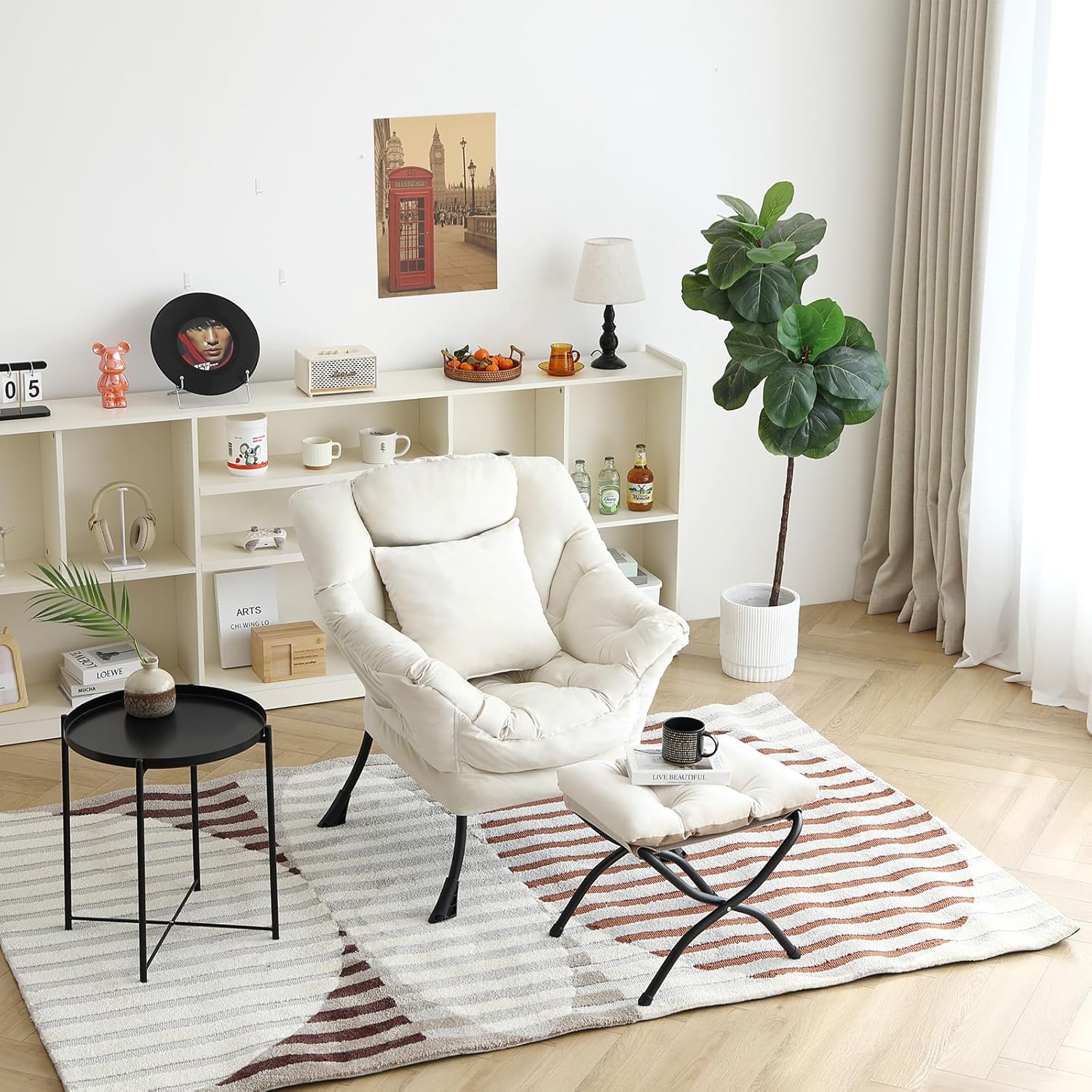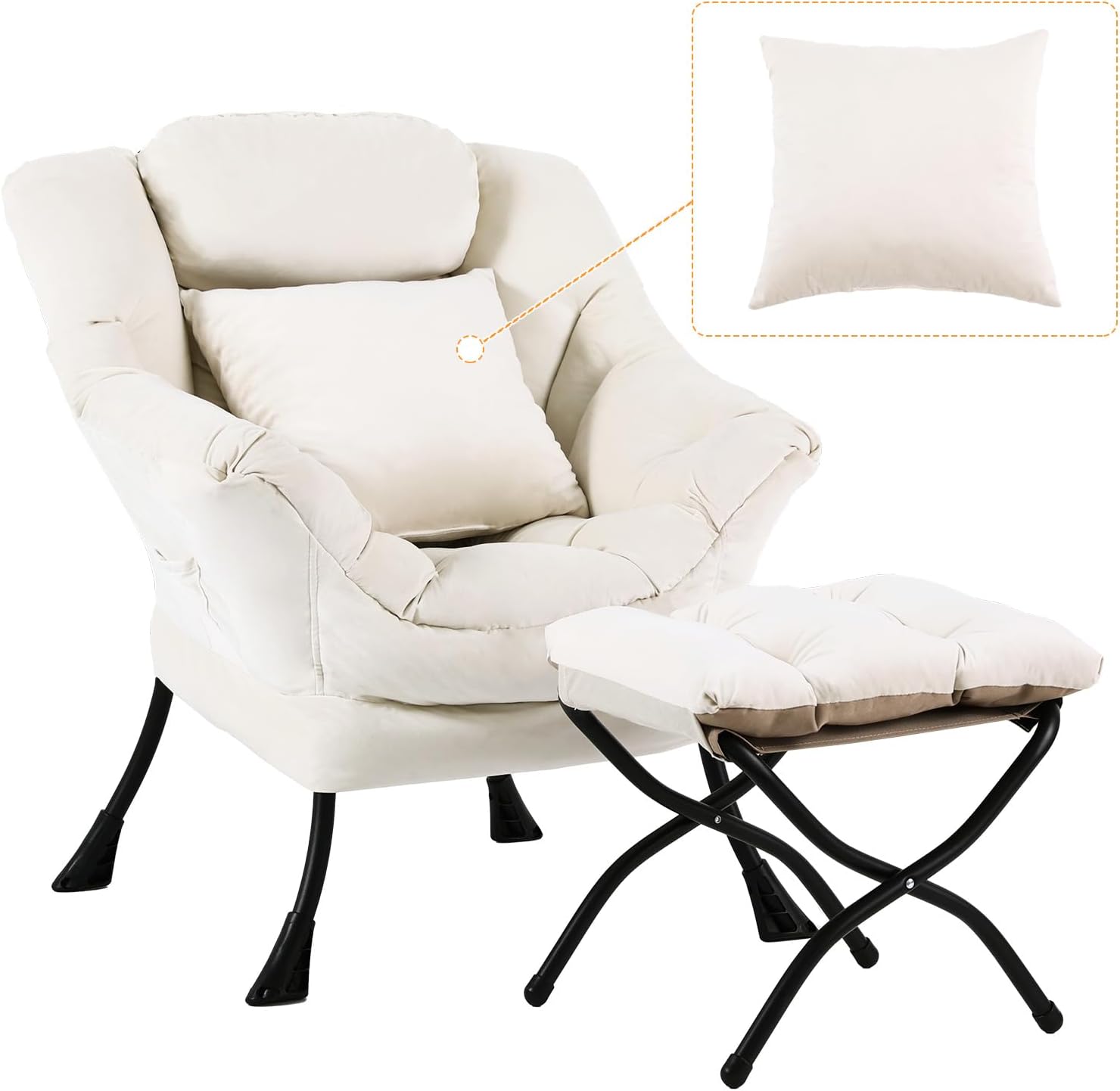 Lazy Chair with Ottoman, Comfy Reading Lounge Chair with Footstool & Throw Pillow Modern with Armrests & Side Pocket for Living Room, Bedroom, Dorm Room, Velvet Beige