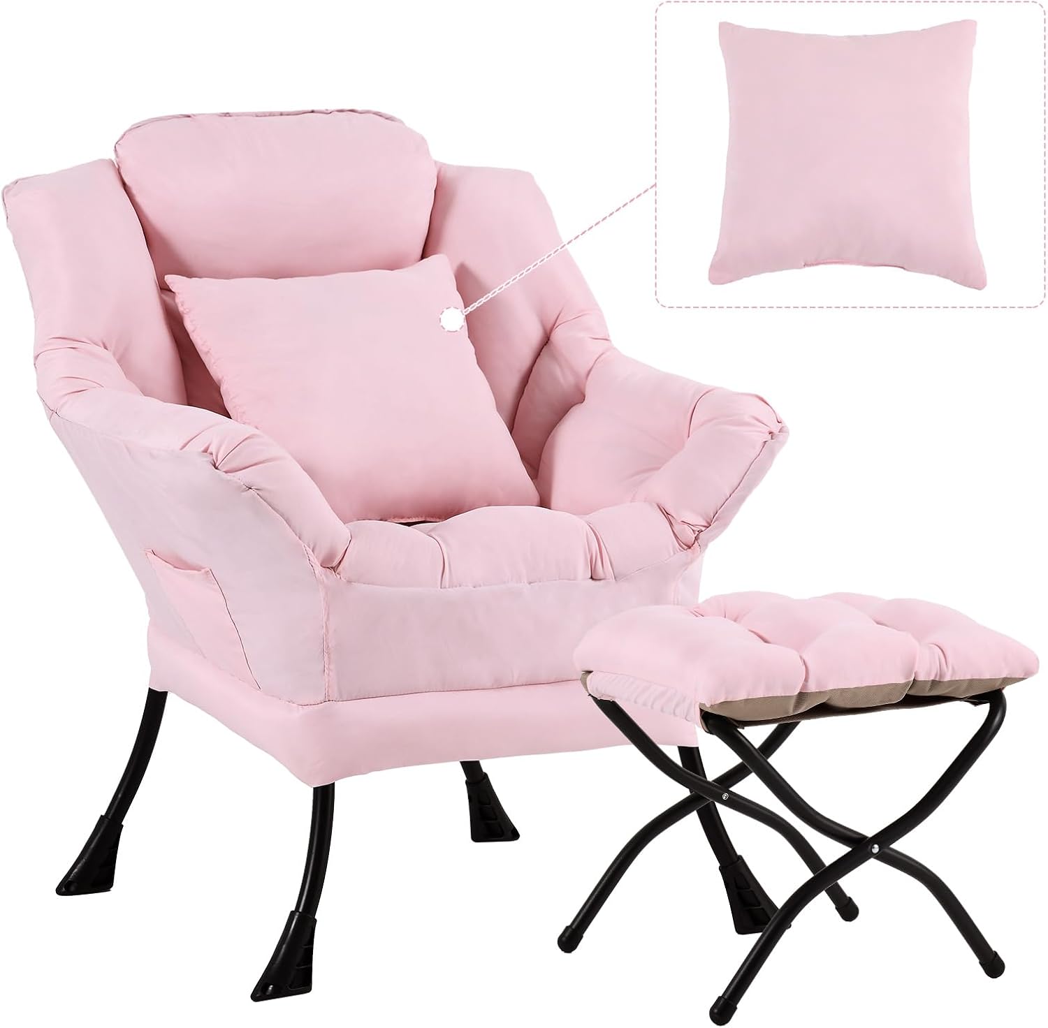 Lazy Chair with Ottoman, Comfy Reading Lounge Chair with Footstool & Throw Pillow Modern with Armrests & Side Pocket for Living Room, Bedroom, Dorm Room, Pink