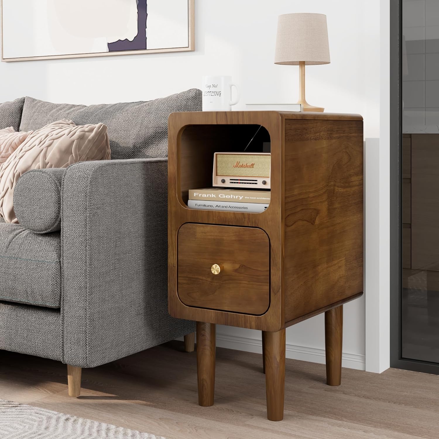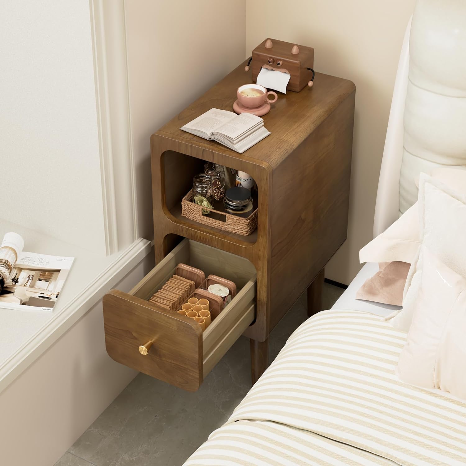 Narrow Nightstand, Solid Wood Night Stand with Drawers, Walnut Mid Century Modern Nightstand, Small Beside Table with Open Storage Shelf for Bedroom (10 inch)