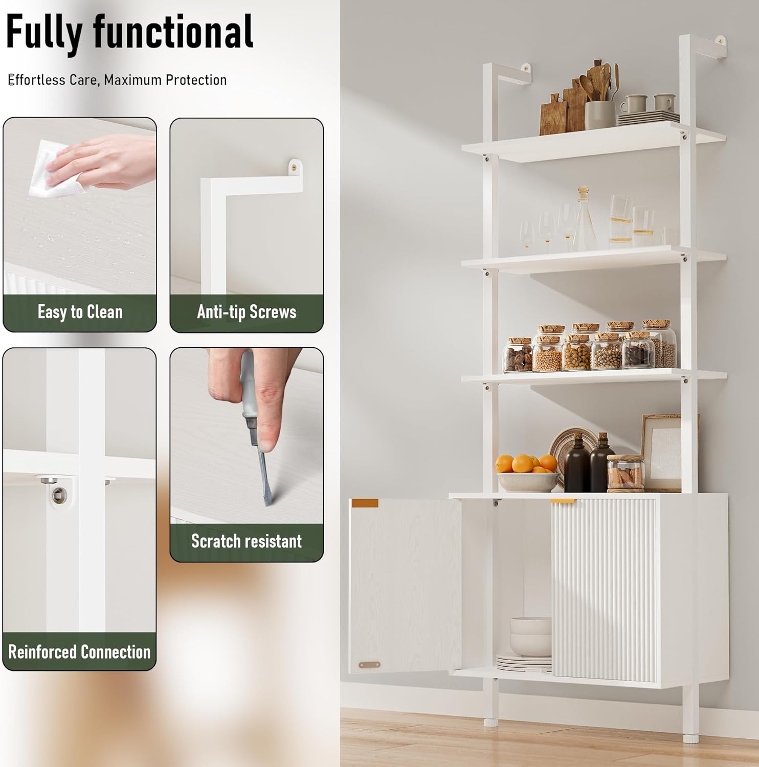 - 【Multi-Functional Storage & Space-Saving】Featuring a 5-tier open ladder bookshelf and a bottom enclosed cabinet, this wall mounted bookshelf offers both display and hidden storage options. Perfect for showcasing books, plants, and decorative items while neatly storing everyday essentials. Its vertical structure maximizes space without occupying much floor area—ideal for living rooms, bedrooms, home offices, or studies.