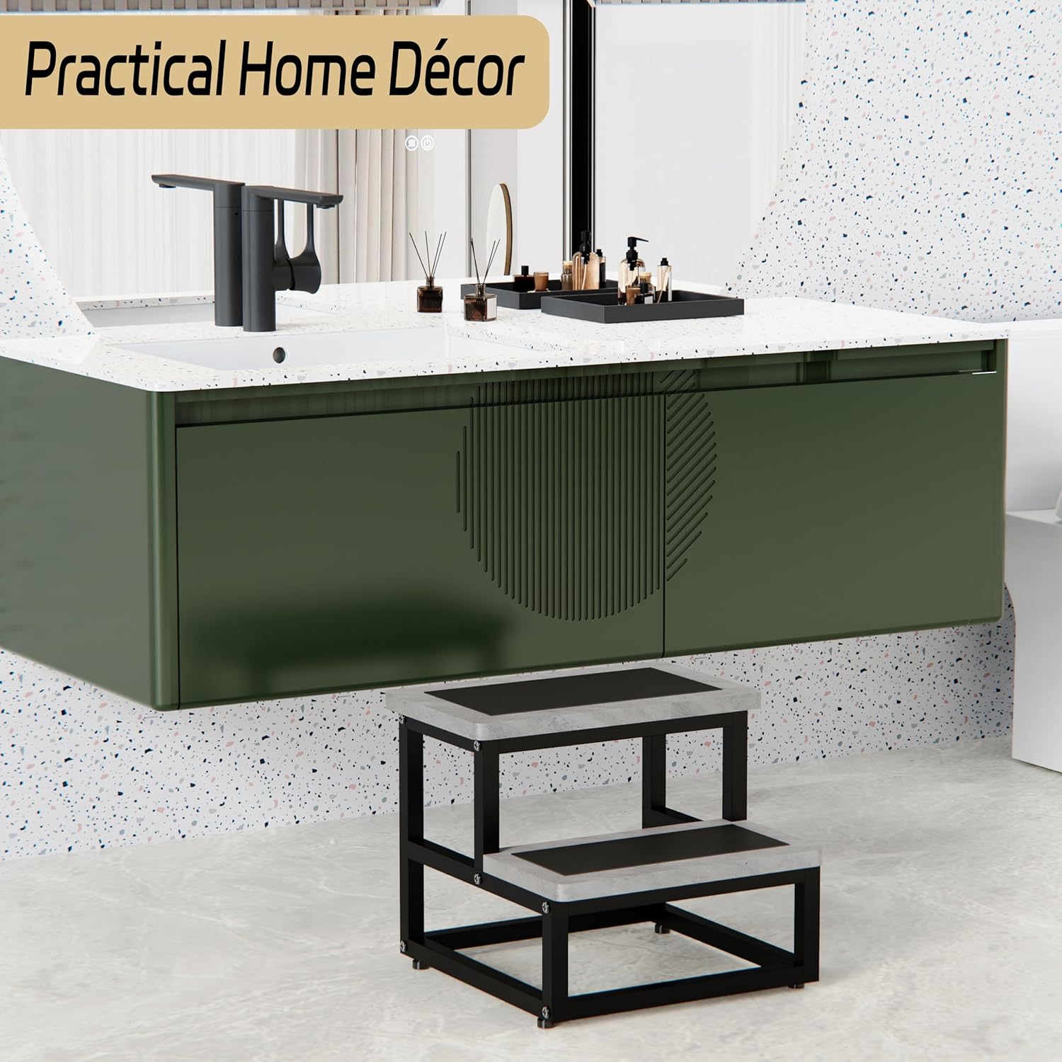 - Non-Skid Mat: The foot stool comes with two non-skid mats featuring a soft surface. Each mat has an adhesive backing, allowing for easy application—simply remove the cover and adhere the mat to the step. It is safe for both you and your children to use