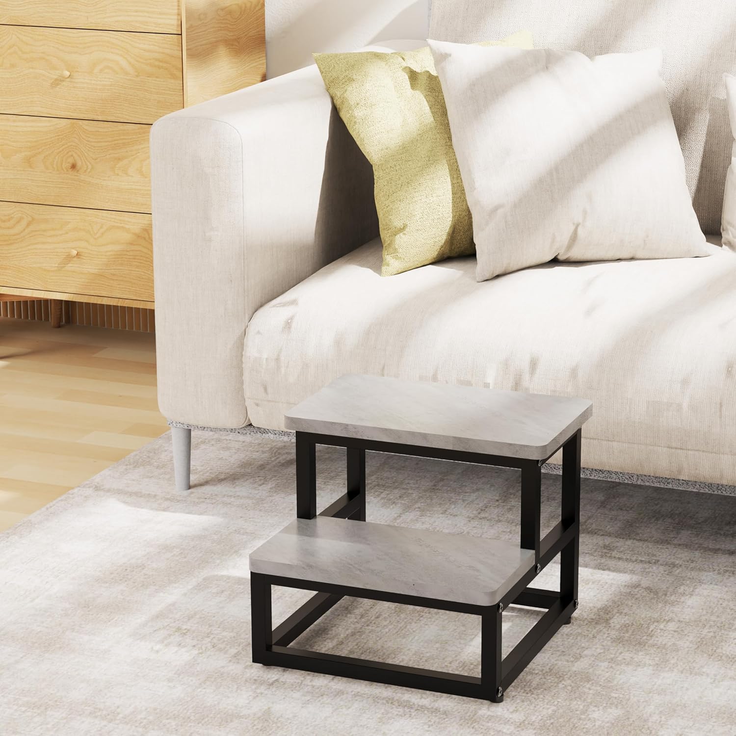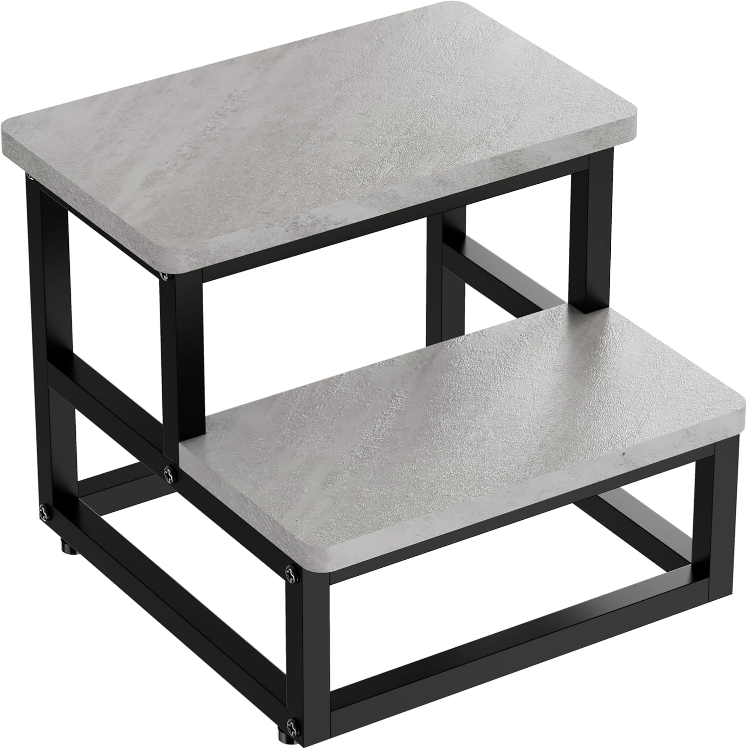 Step Stools, Heavy Duty Stepping Stool for Kids Adults, Non-Slip Metal and Wooden 2 Steps Foot Stool for High Beds and Kitchen, Round Corner, 500 Lbs Capacity, Cement Gray