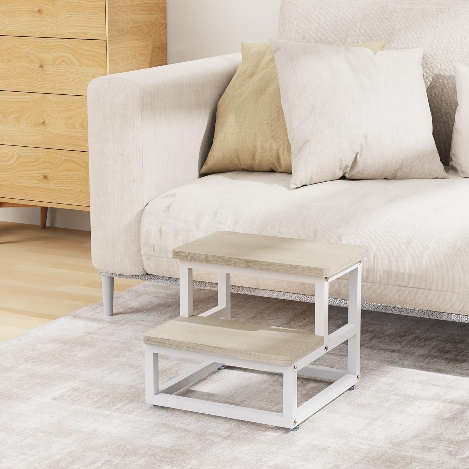 Step Stools, Heavy Duty Stepping Stool for Kids Adults, Non-Slip Metal and Wooden 2 Steps Foot Stool for High Beds and Kitchen, Round Corner, 500 Lbs Capacity, White Oak
