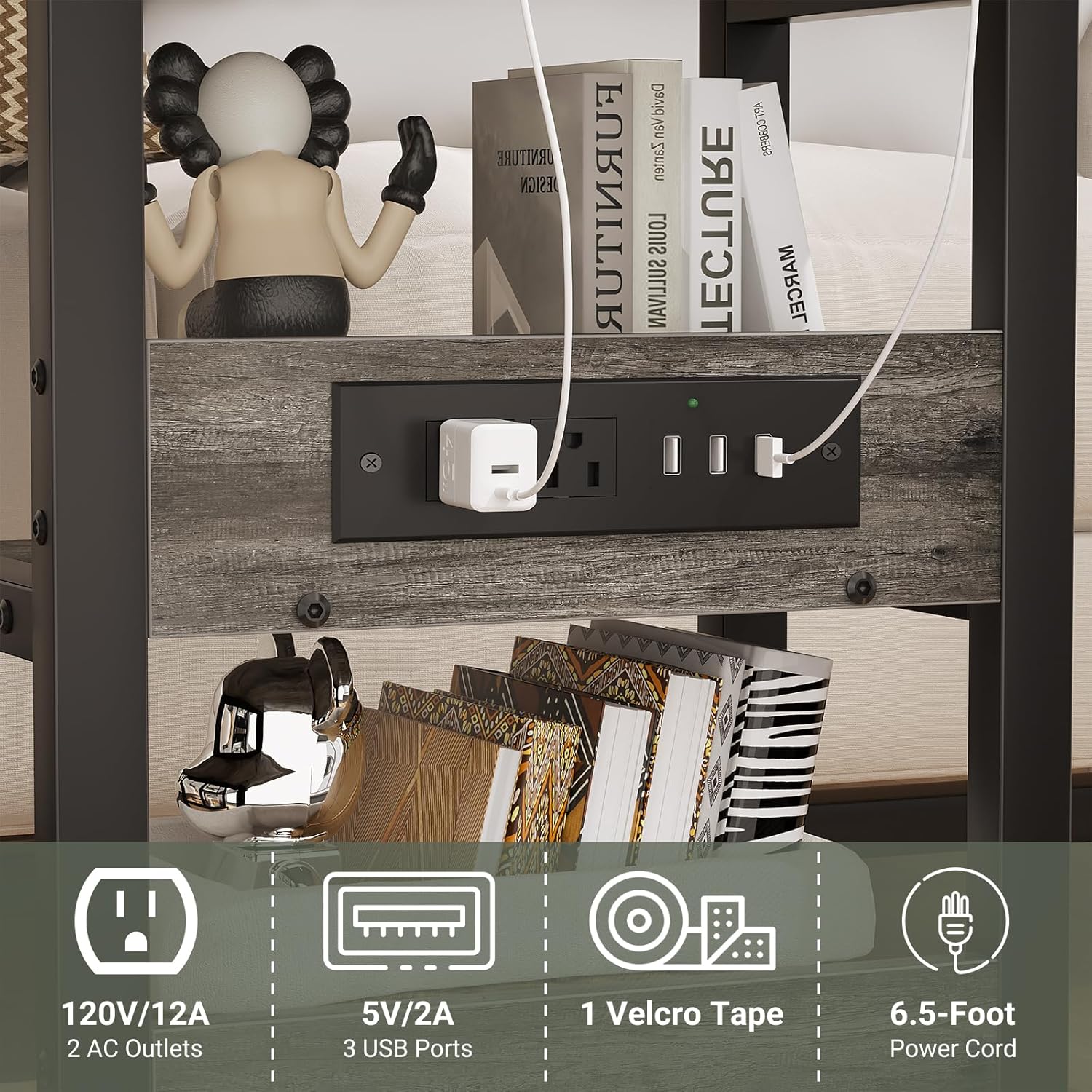 - C Shaped Side Table with Charging Station: Besiost c shaped couch table come with 2 AC outlets and 3 USB ports, 6.5ft long power supply cord can easily allow you to plug in phones, laptops, AirPods, etc. Velcro tape make your device's cords tidy.