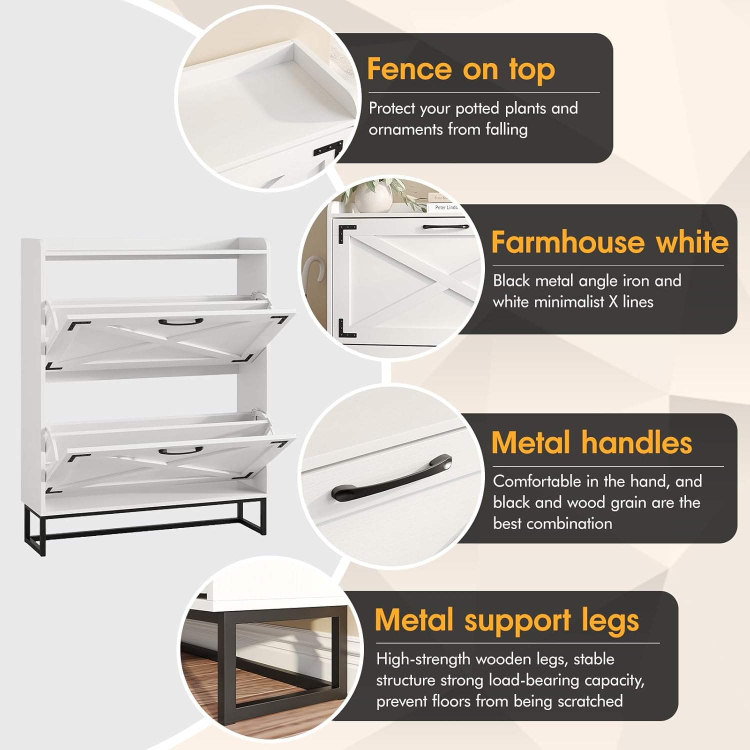 - Entryway Shoe Cabinet: The hidden shoe storage cabinet with 2 flip doors, stylish and simple black white makes it a neat and beautiful finish and looks great in many different home styles. Perfect for placing in the entryway, hallway, living room, or porch, provides a neat looking in your home and space saving
