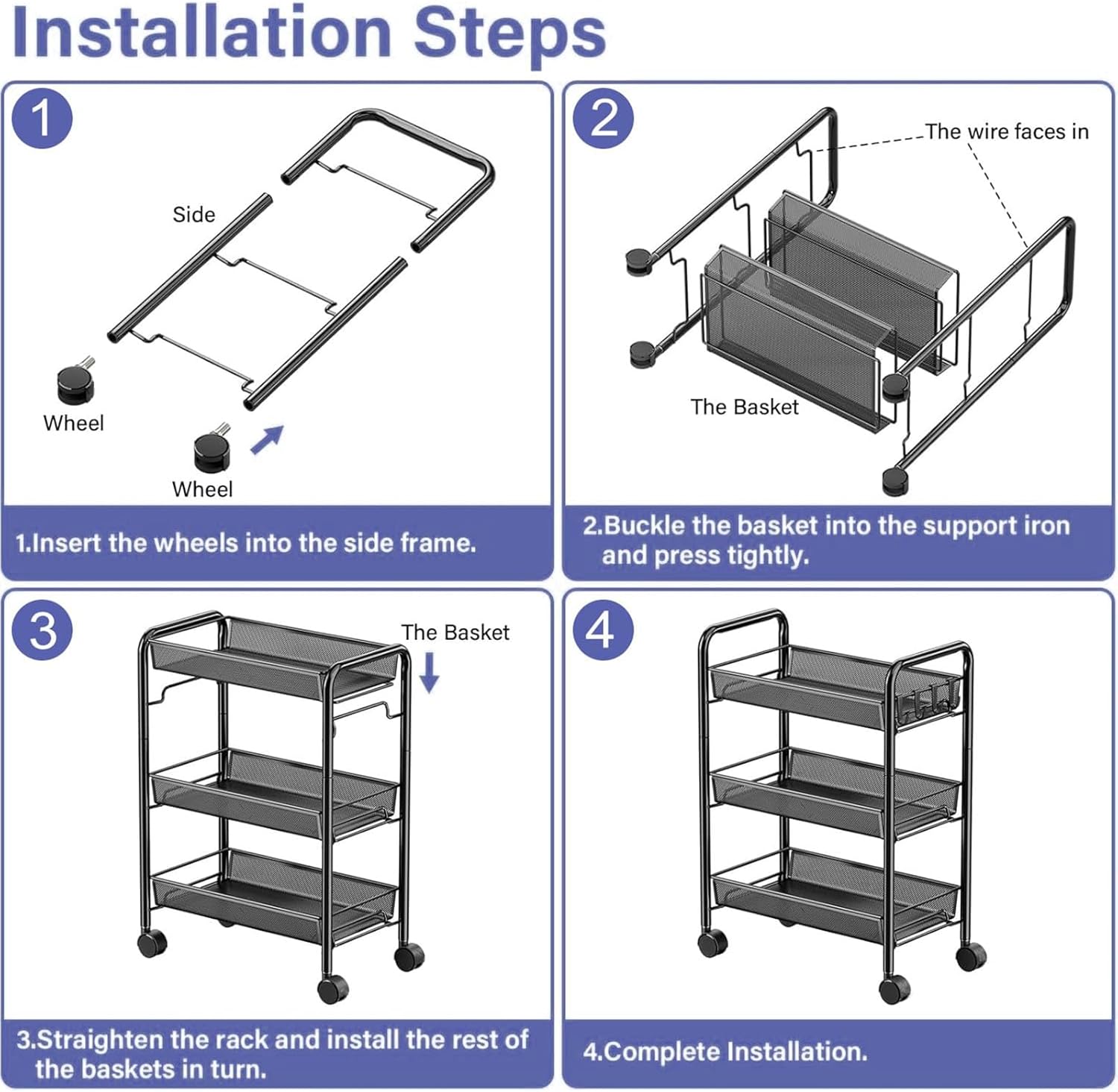 - 【Simple Assembly】This practical metal trolley does not require tools for installation. Just snap the units together and it can be easily assembled. Equipped with 4 side hooks can be used to store bath balls, scissors, spoons, rags, headphones and keys, etc., maximizing the use of space, enhancing cleanliness and meeting the storage needs of homes, offices, etc