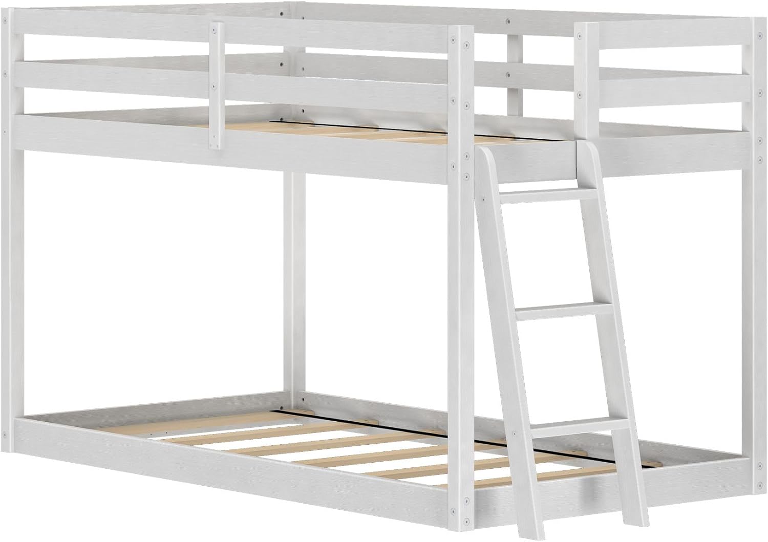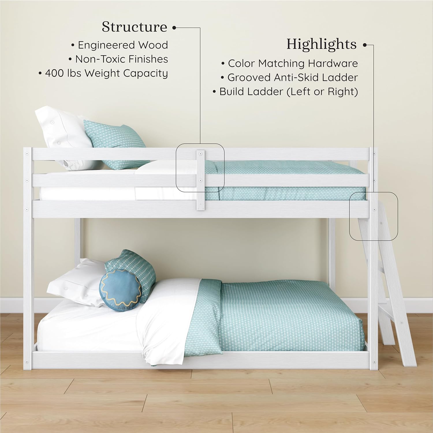 - Durable Build: Floor bunk bed is built with durable engineered wood and color-matched hardware to balance sturdy construction with sleek style. Each bunk has wooden slats and a metal support bar that contribute to a 400 lb. weight capacity per bed.