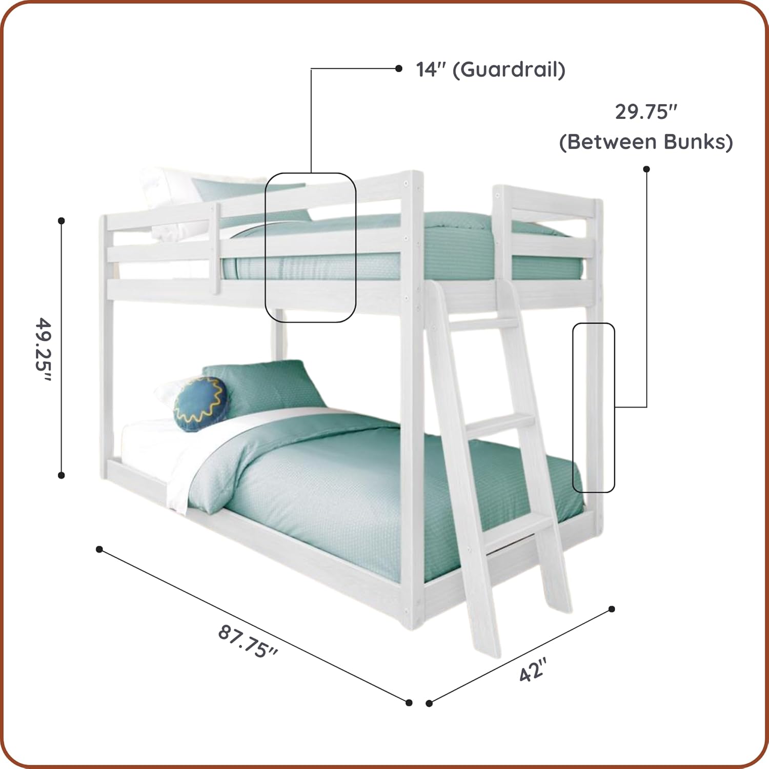 - Safe for All Ages: This twin over twin bunk bed for kids stands 49” tall with 14" guardrails and a bottom bunk that sits 2” off the ground, making it safe for younger kids.