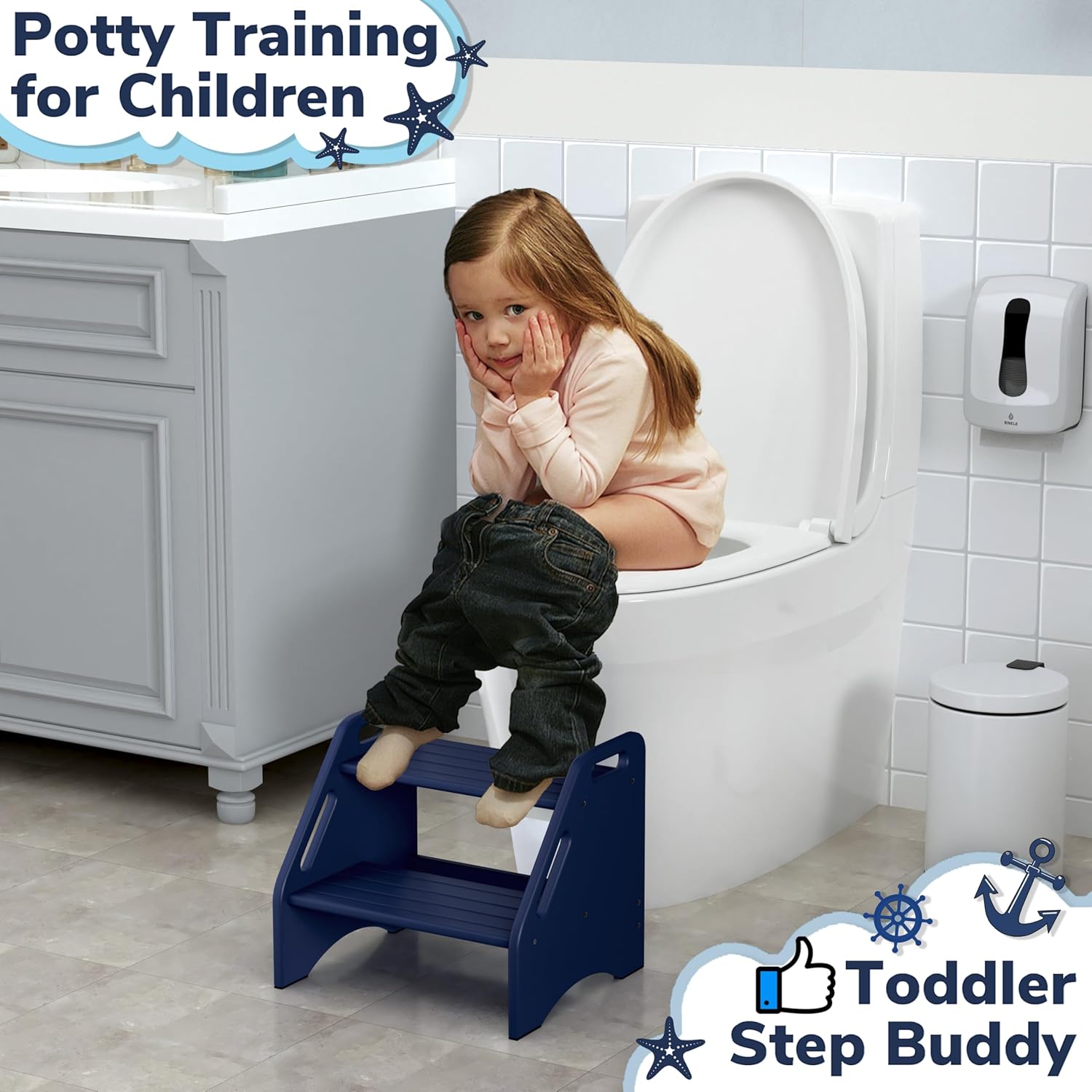 AMBIRD Wooden Step Stool, Two Step Stools Toddler 300 lbs Capacity with Safety Non-Slip Pads and Handles, Bamboo Step Stool for Bathroom, Kitchen Dual Height Step Stools for Kids (Navy Blue)