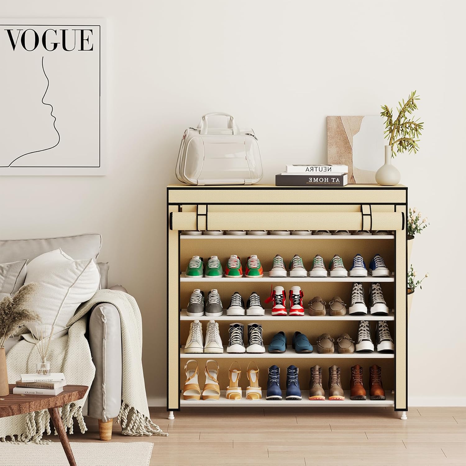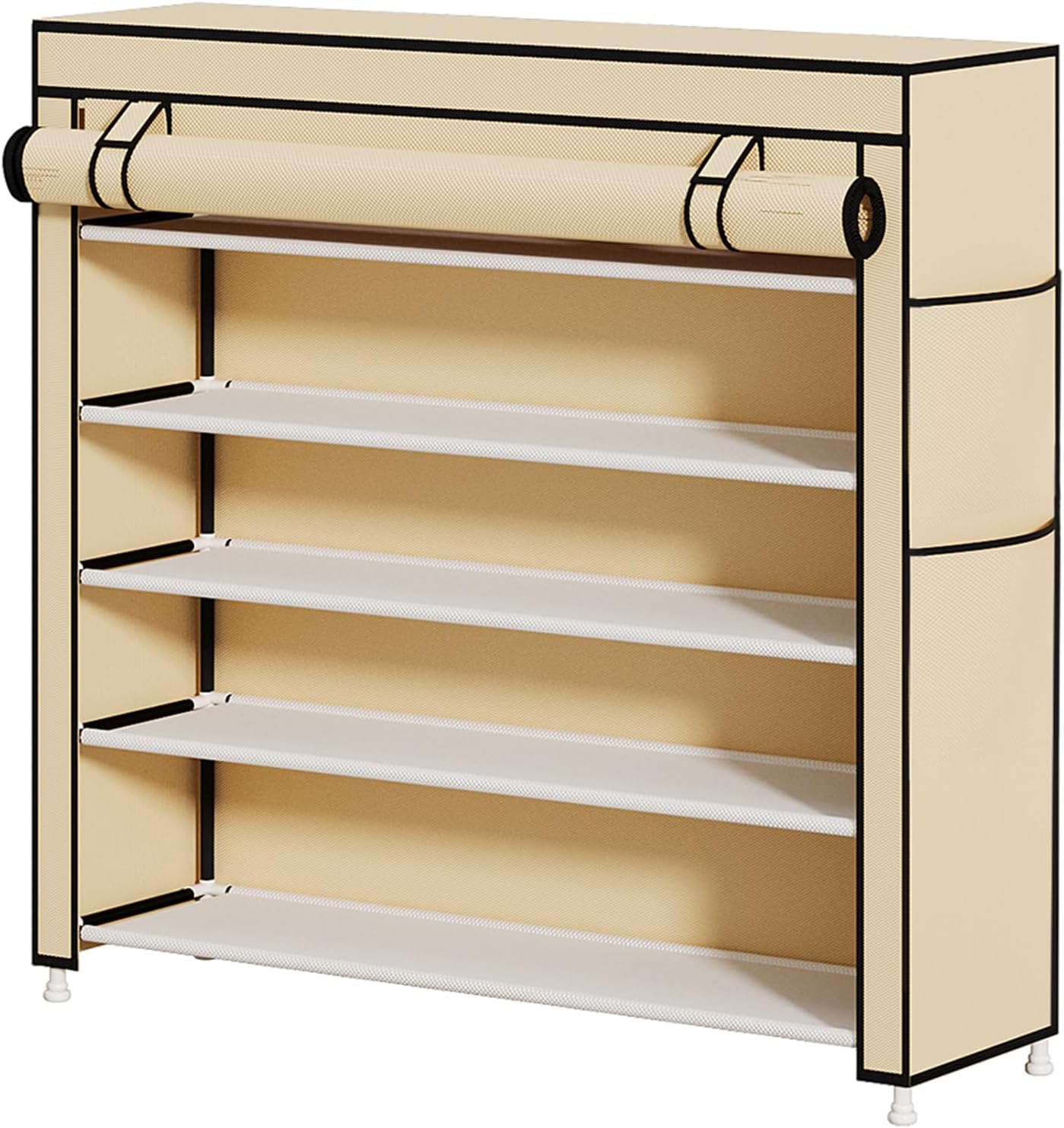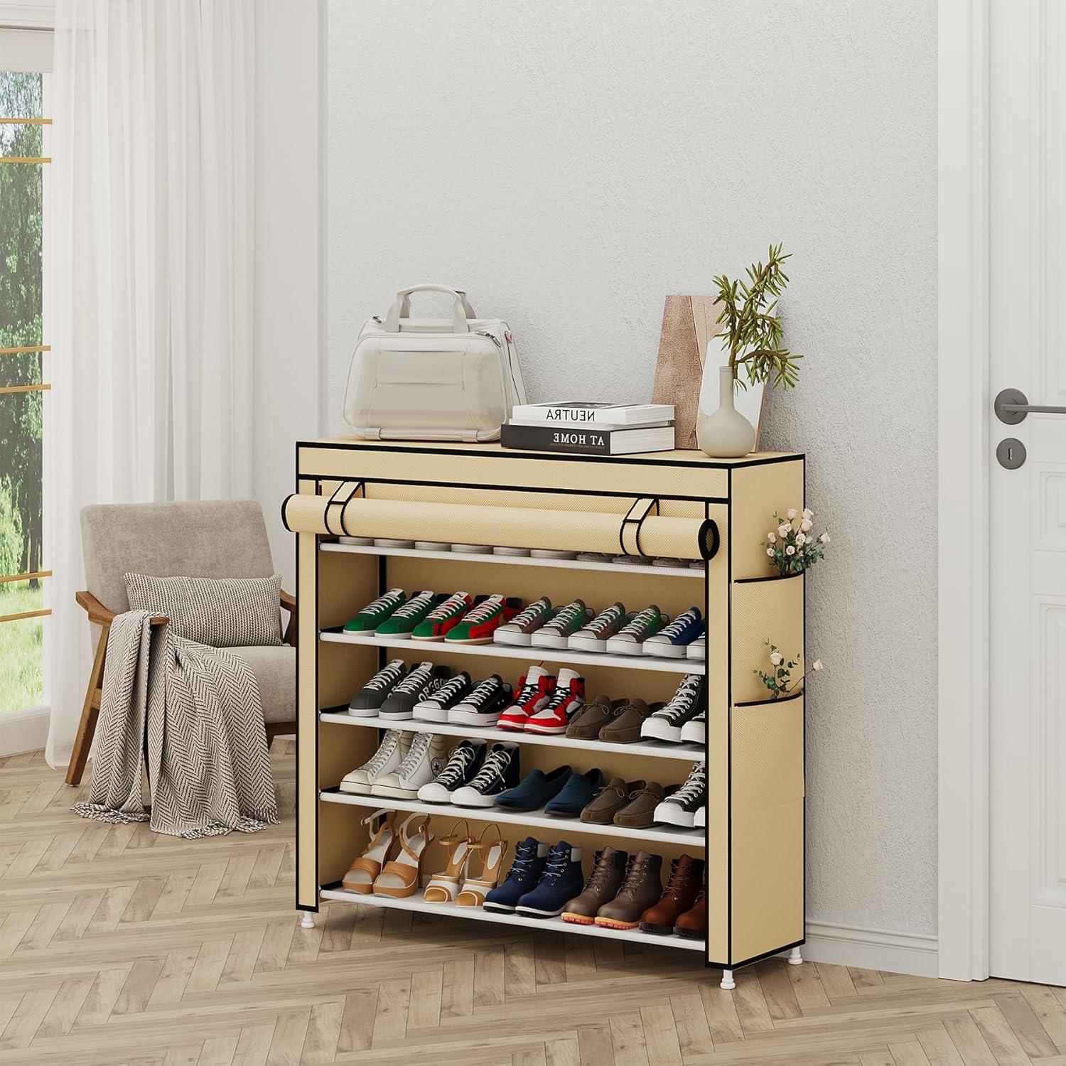 Calmootey 5 Tier Shoe Rack Organizer to Hold 25 Pairs, Portable Shoe Shelf with Nonwoven Fabric Cover for Closet Hallway, Bedroom, Entryway, Beige