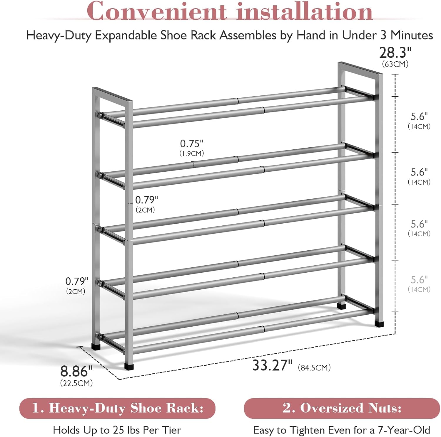 - EXPANDABLE SHOE RACK FOR CLOSET: Perfect for closet, this 5-tier shoe rack stretches from 18 to 33 inches and holds up to 20 pairs of adult shoes. Designed to freely stretch and adapt to your small space, ensuring a perfect fit with its easily adjustable length.