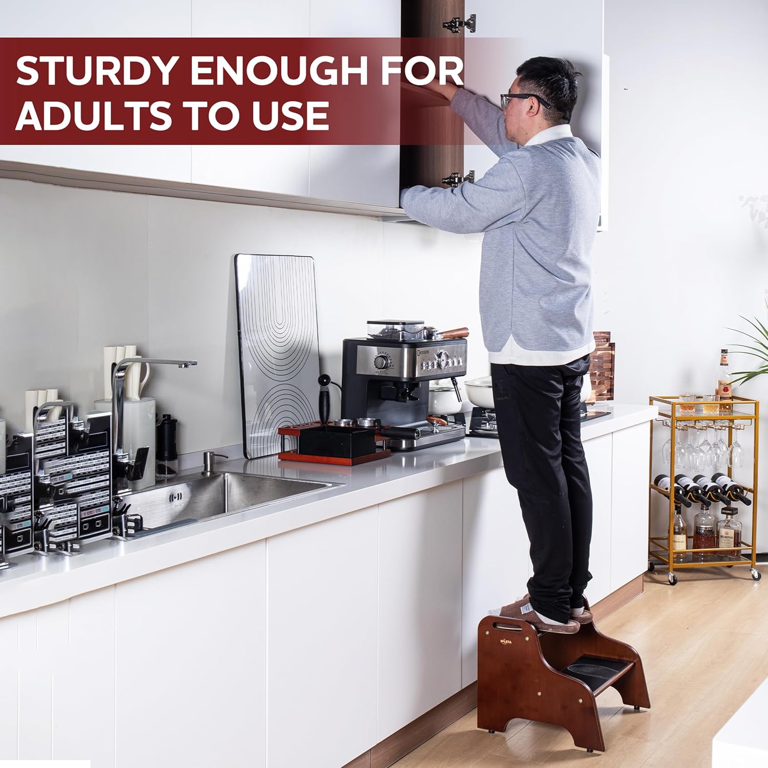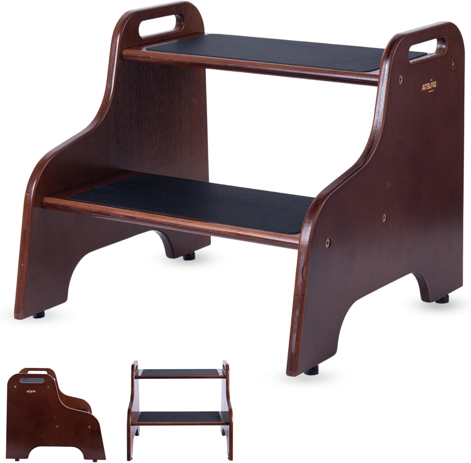 2-Step Wooden Step Stool for Adults & Kids – Non-Slip Bed, Bathroom, Kitchen, and Closet Use – Heavy-Duty Portable Step with Handles – 400 lb Capacity
