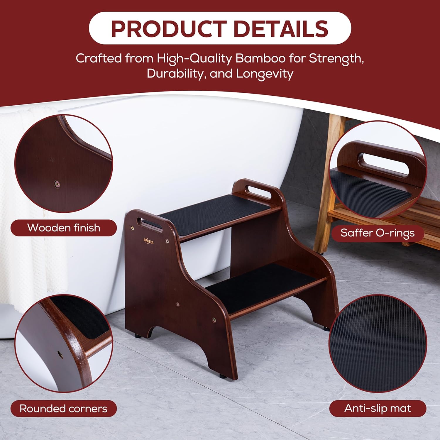 - Heavy-Duty Build for Kids & Adults Crafted from durable bamboo wood, this 2-step stool supports up to 400 lbs, making it ideal for kids, adults, and seniors. Perfect for use beside high beds, sinks, or shelves.