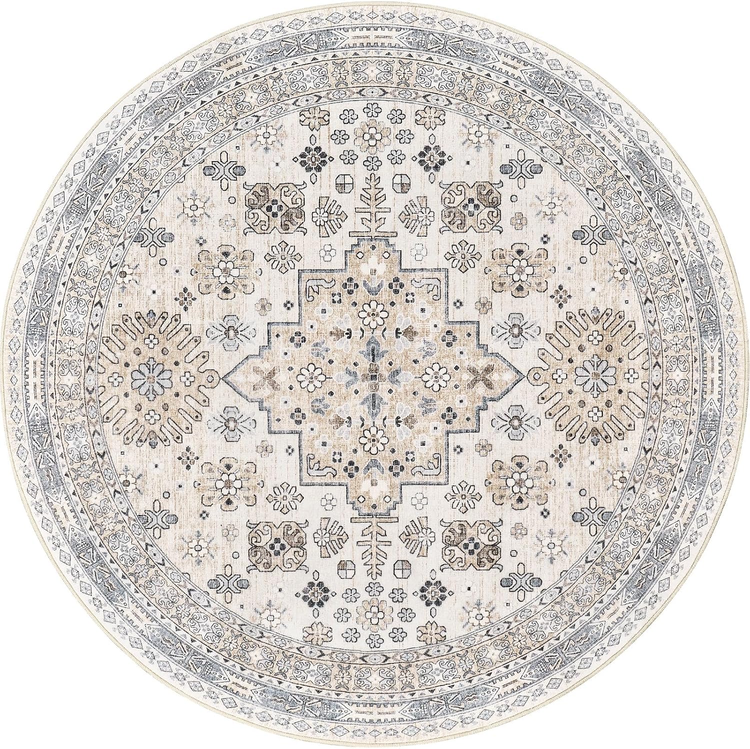 zesthome 8ft Round Rugs for Living Room, Non-Slip Washable Round Area Rugs, Ultra-Thin Large Circle Rugs, Soft Low Pile Rug for Bedroom, Kitchen - Vintage Stain Resistant Round Rug (Beige,8'x8')