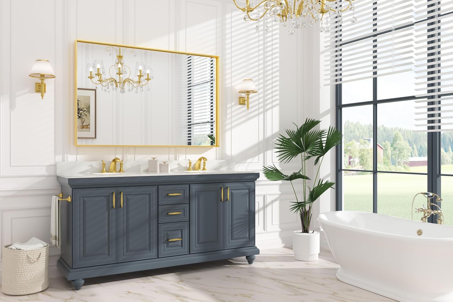 - 【Exceptional Quality】Our gold rectangle bathroom mirror is made of HD 5mm glass, bright and anti-distortion, which provides excellent reflection. Aluminum alloy frame and PVC shatterproof film would strengthen the floating glass for safety, waterproof and anti-corrosion in wet bathroom environments.
