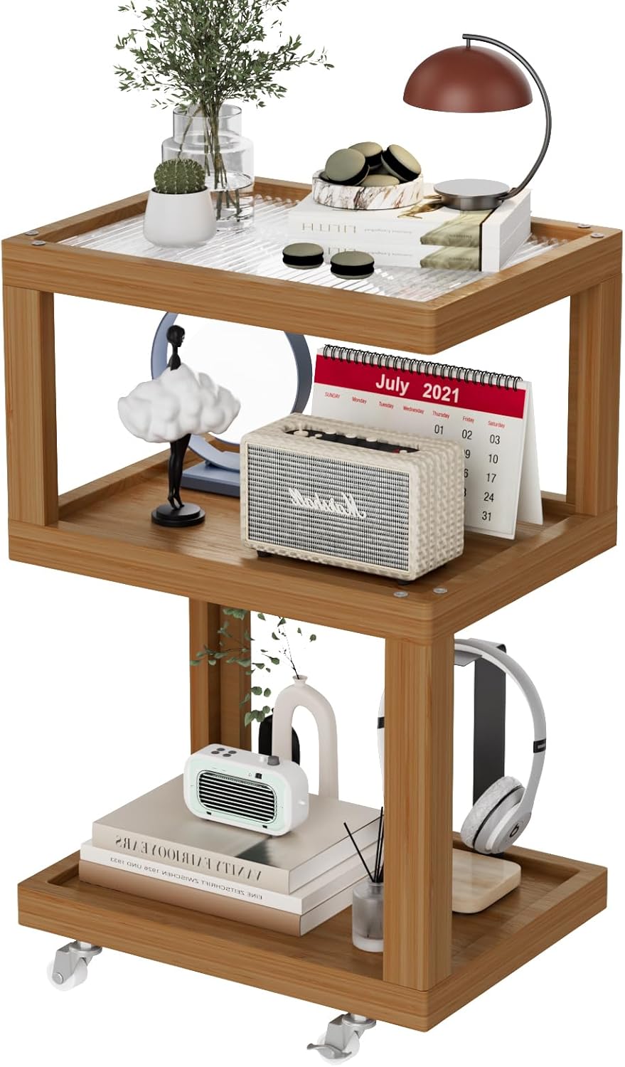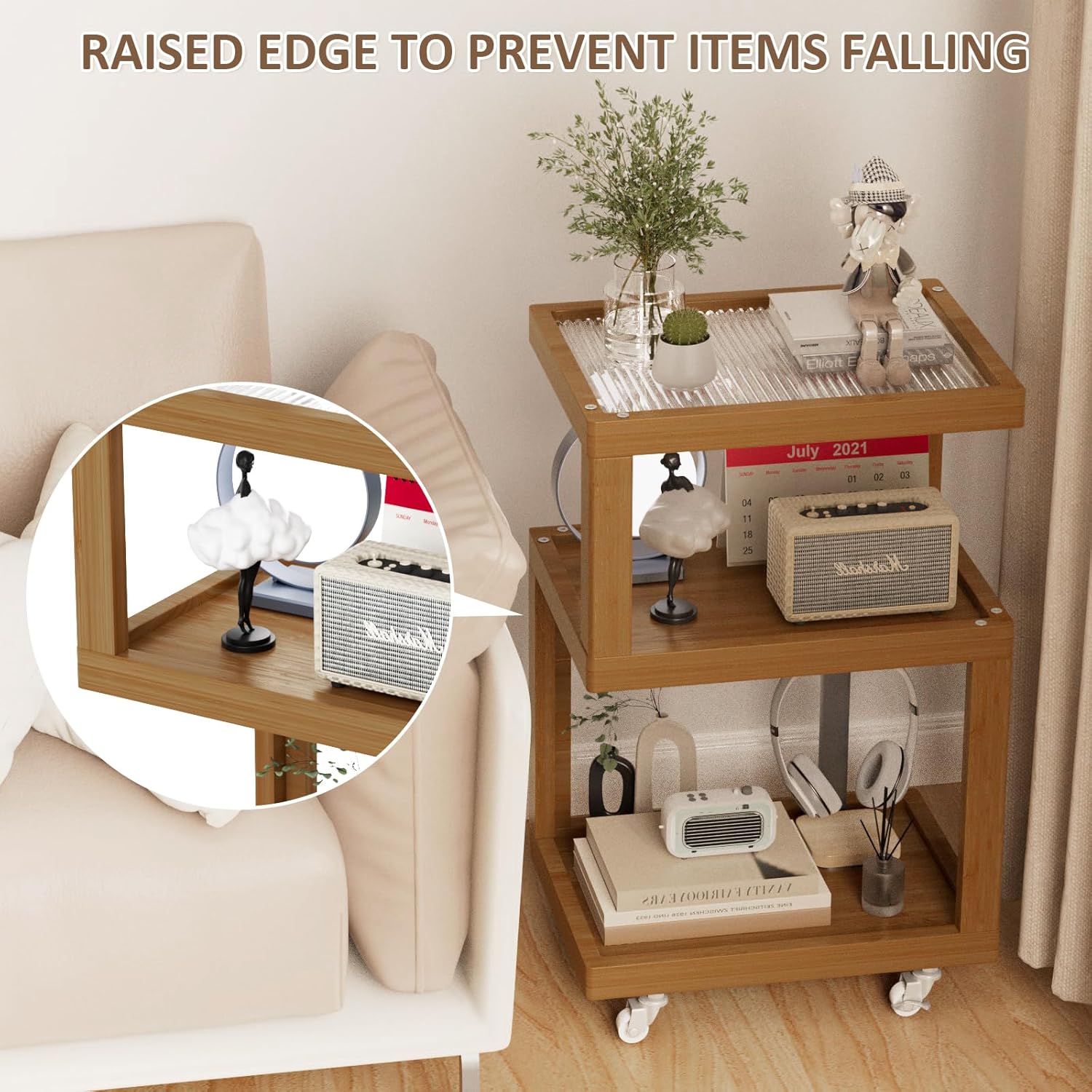 3-Tier Side Table - Walnut Geometric Design with Glass Top & Wheels, Sofa & Bedside Table for Small Spaces, Living Room & Bedroom Modern Minimalist