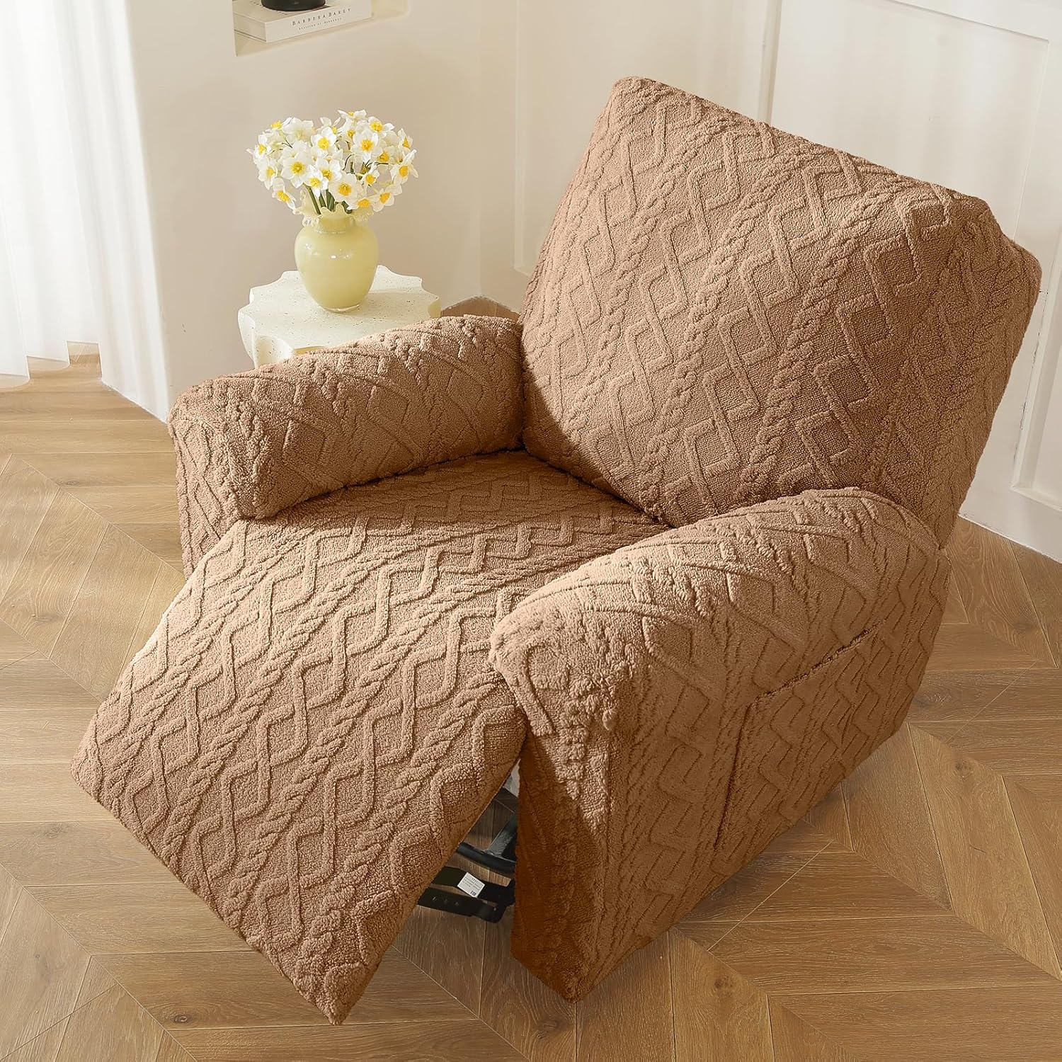 vctops 4 Pieces Geometric Jacquard Plush Recliner Slipcovers Soft Fuzzy Fluffy Sofa Couch Cover Anti-Slip Furniture Protector with Elastic Bottom for Kids Cats Dogs(Brown,1 Seat)